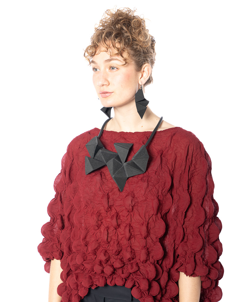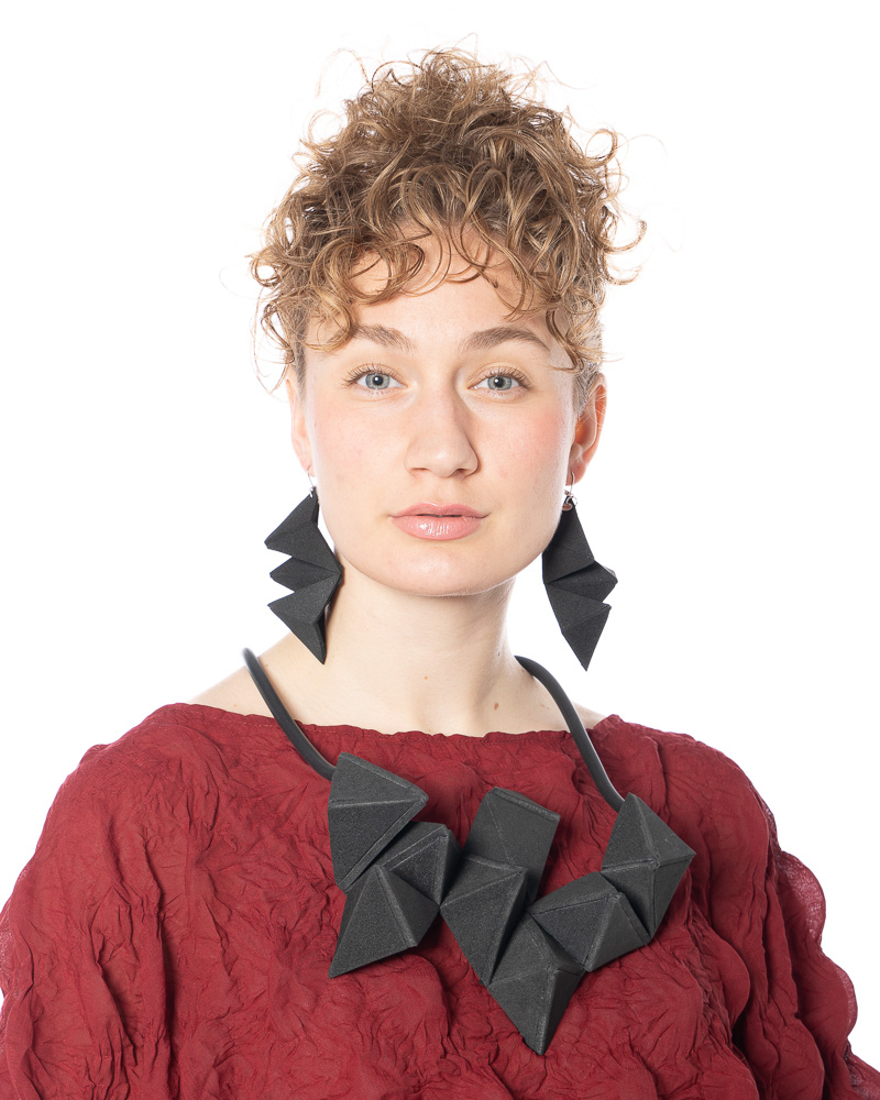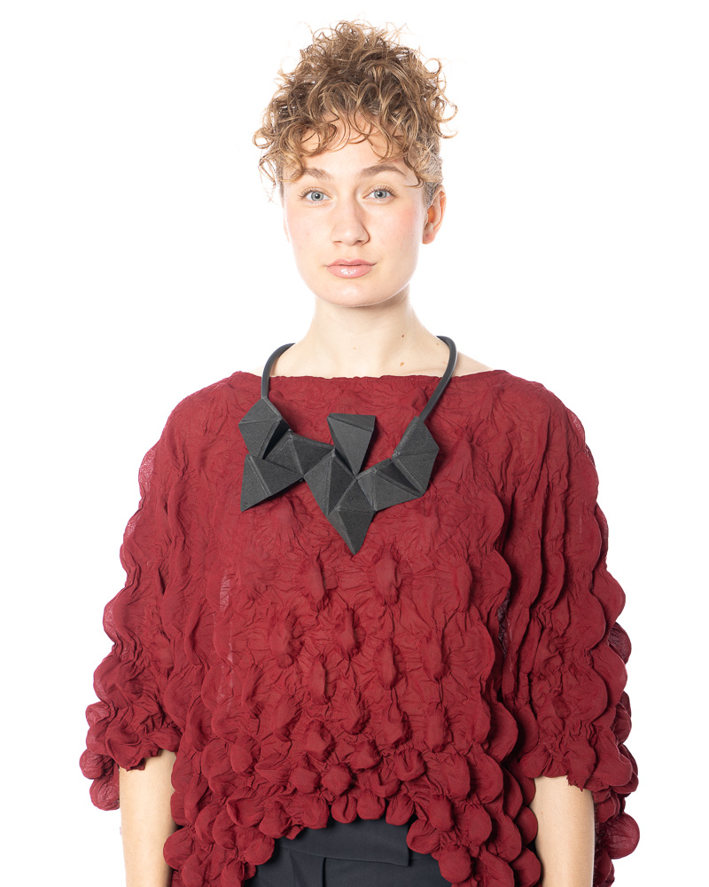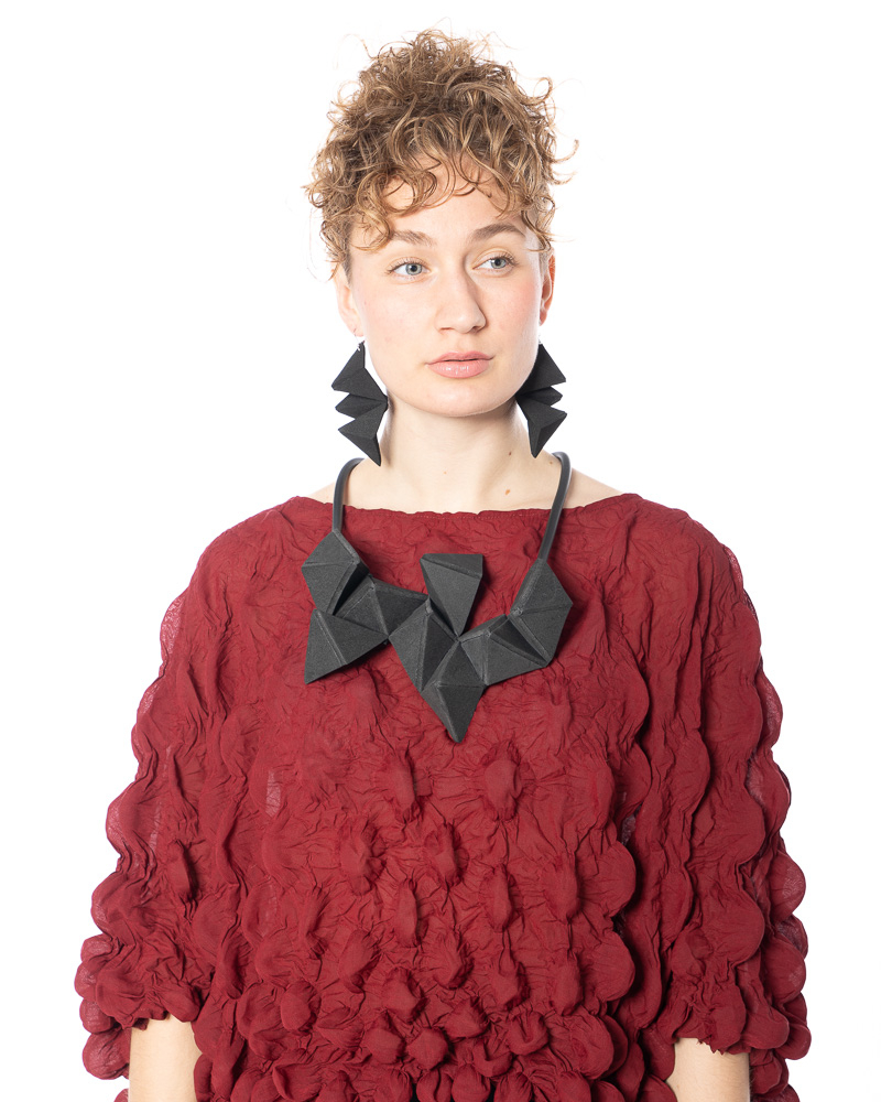 Geometrische Halskette im Kubismus-Stil aus Gummi Unsere geometrische Halskette im kubistischen Stil aus Gummi von dem Label MIKAs ist ein moder...