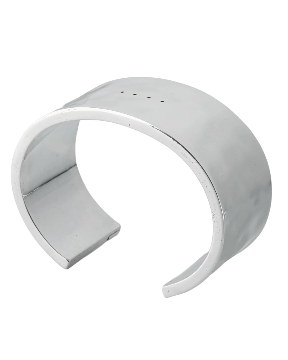 Der Parts of Four, Ultra-Reduktionsarmreif des Designerlabels Parts of Four präsentiert sich als außergewöhnliches Schmuckstück, das durch seine präzise Hohlkonstruktion überzeugt. Jeder Armreif wird aus Metallblech von Hand gefertigt, wobei das Material sorgfältig in einzelne Segmente geschnitten und anschließend zusammengesetzt sowie verlötet wird, um die charakteristische dreidimensionale Form zu erzielen. Die Basis aus poliertem Messing verleiht dem Schmuckstück Stabilität, während die abschließende Galvanisierung mit hellem Silber für ein glänzendes Finish sorgt. Mittig auf der Oberfläche befinden sich vier kleine, exakt platzierte Löcher, die als dezentes, aber wirkungsvolles Detail das minimalistische Design unterstreichen.