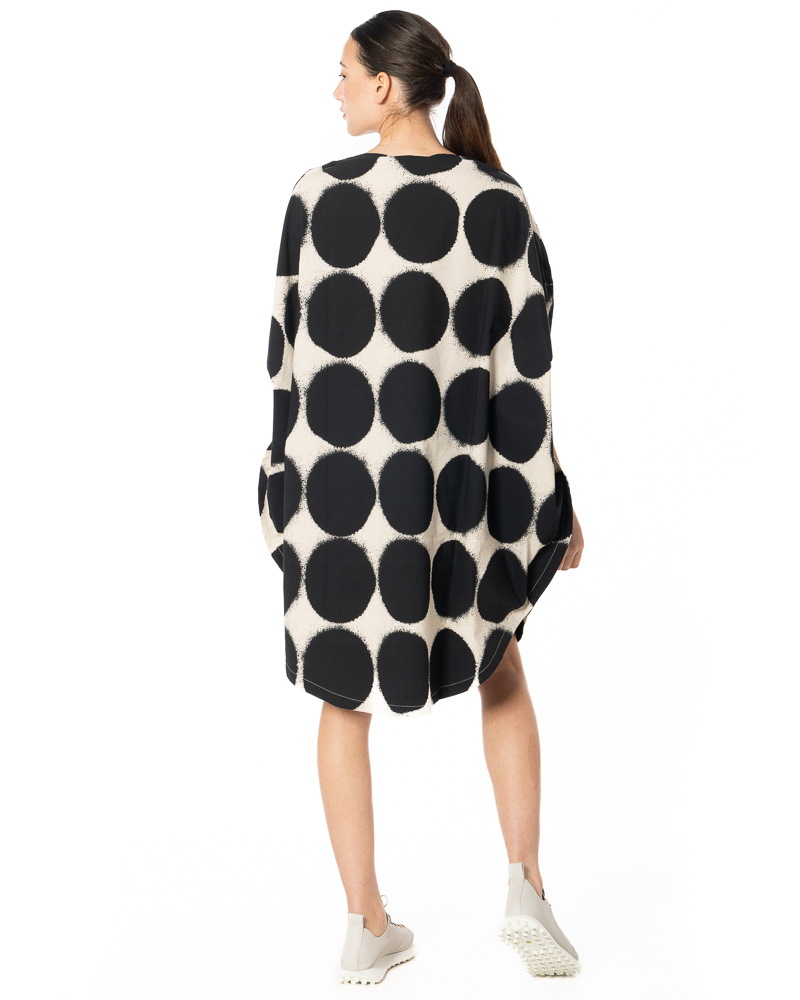 Im Nu angezogen und zack: top gestylt! Dieses RUNDHOLZ Kleid zelebriert die Kunst der Wiederholung im zeitlosen Punkt-Muster. Die großformatigen Dots wirken wie in einem schnellen Gestus aufgesprüht, bewusst unregelmäßig, fast pulsierend. Spraypaint-Ästhetik trifft auf grafische Präzision, Street Art verschmilzt mit der charakteristischen RUNDHOLZ Design-DNA. Der Punkt gilt als Symbol für Anfang, Fokus und Bewegung – hier neu interpretiert als grafisches Statement mit künstlerischem Unterton. Der runde, ballonartige Schnitt verleiht dem Onesize-Kleid Volumen und eine zeitlose Präsenz, ohne an Leichtigkeit zu verlieren.