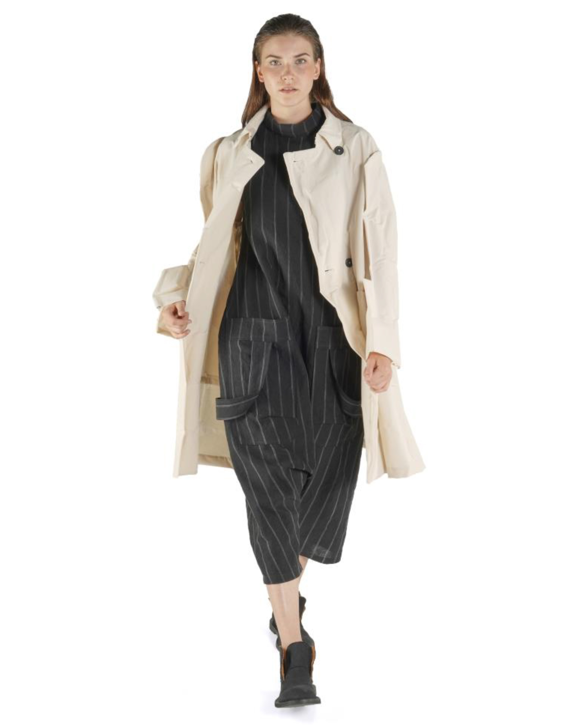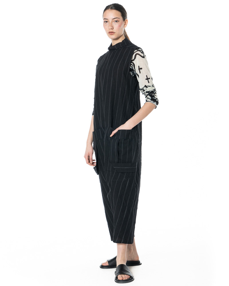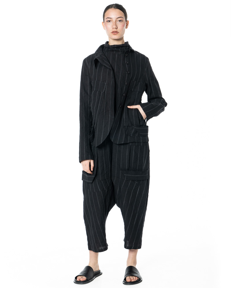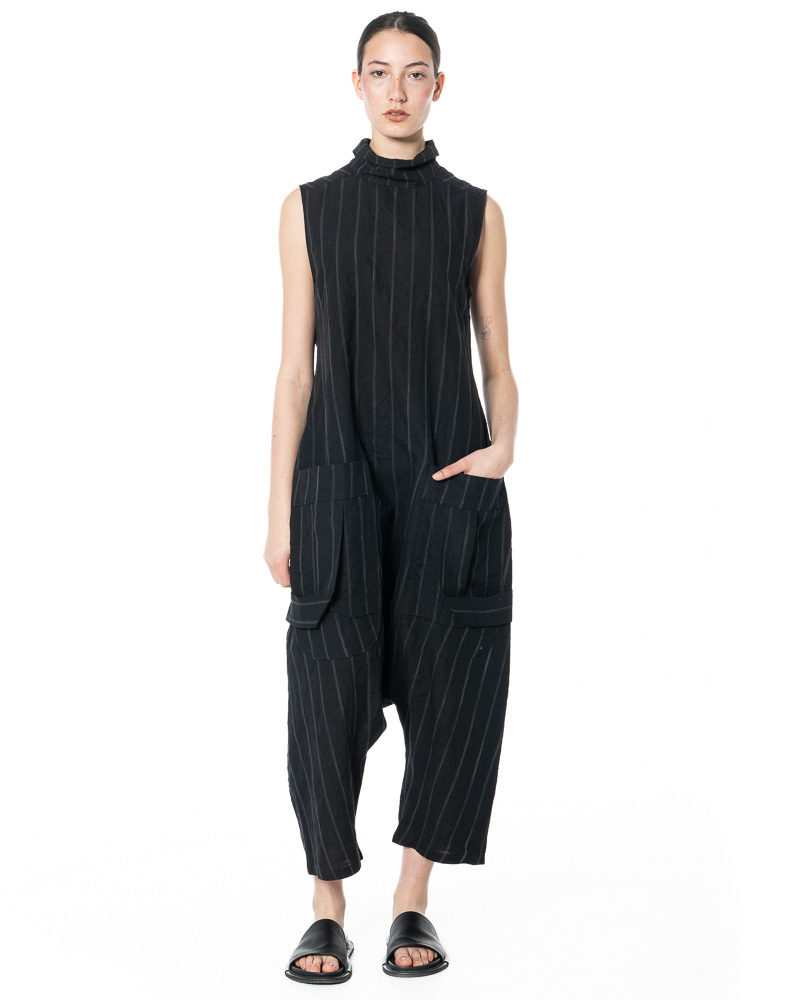 Streifen feiern ihr großes Revival – aber nicht brav, nicht klassisch, sondern als kraftvolles Style-Statement. Dieser RUNDHOLZ Overall ist die radikale, moderne Antwort auf den Pinstripe-Trend: ein Piece, das Oldschool-Businesscodes zerlegt und sie in pure Avantgarde verwandelt. Mit seinem hohen, asymmetrischen Kragen, dem ärmellosen Design und der voluminös-dekonstruierten Silhouette schafft er eine Figur, die bewusst mit Proportionen spielt. Der Schritt etwas tiefer gesetzt, die Beine ballonartig geformt, der Fall weich und zugleich strukturiert.
