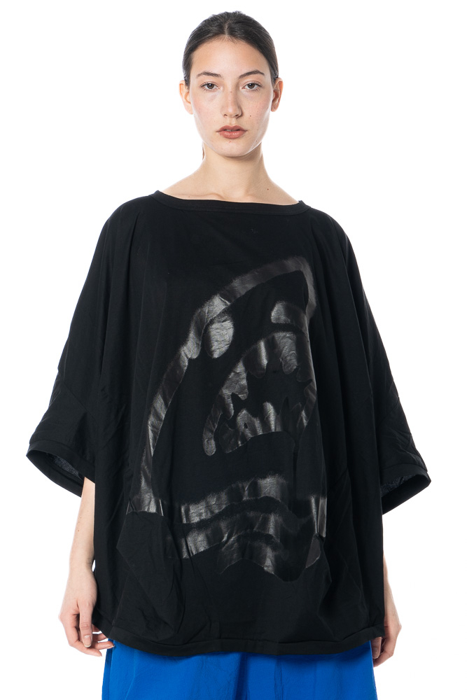 Dieses RUNDHOLZ-Shirt ist ein modisches Augenzwinkern in Übergröße: ein Hai-Graffiti, das aussieht, als wäre es direkt aus einem urbanen Street-Art-Atelier auf Baumwoll-Jersey gesprungen. Der markante Print wirkt roh, reduziert und gleichzeitig unglaublich ikonisch. Der Schnitt spielt perfekt mit dieser Energie: oversize, mit lässig fallenden Fledermausärmeln und einer breiten Saumweite, die dem Look diese entspannte Silhouette verleiht.