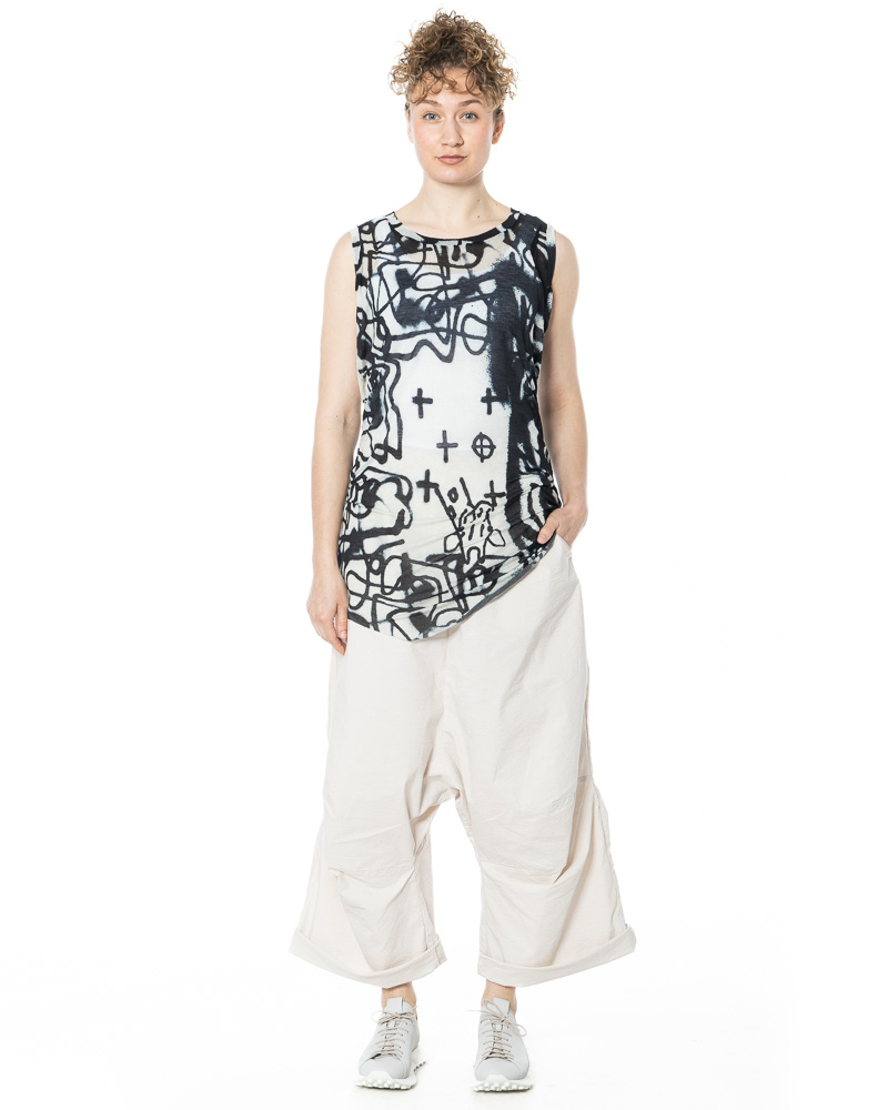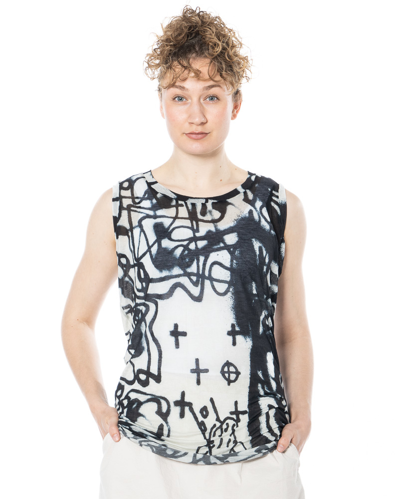Ausdrucksstarke Kunstprints sind wieder voll in Mode! In dieser Saison geben abstrakte Sprühmuster den Ton an. Dieses lang geschnittene Tanktop von RUNDHOLZ übersetzt genau diese Kunstform in ein tragbares Alltags-Design. Der ikonische Allover-Print erinnert an dynamische Spraydosen-Kunst, die super dynamisch und lebendig wirkt. Das Oberteil ist aus einer fließenden Mischung aus Lyocell und Seide gefertigt und fühlt sich auf der Haut kühl und federleicht an. Ein Rundhalsausschnitt und breite Träger rahmen die Silhouette ein, während der schmale, figurbetonte Schnitt durch einen dekorativen, abgerundeten Saum vorne aufgelockert wird.