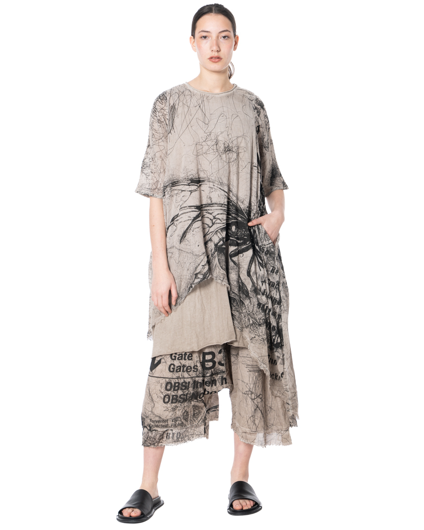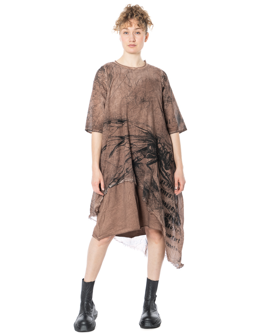 Die Asymmetrische Designer-Tunika des Labels studiob3 präsentiert sich als großzügig geschnittenes Oberteil, das durch seinen langen, oversized Style auffällt. Gefertigt aus einer Kombination von leichtem Baumwoll-Voile und Single Jersey, bietet die Tunika eine doppellagige Verarbeitung, die für eine interessante Textur und einen angenehmen Griff sorgt. Besonders charakteristisch ist der asymmetrische Saum, bei dem die linke Seite deutlich verlängert ist und so eine dynamische Silhouette erzeugt. Die offenen, ungesäumten Kanten unterstreichen den modernen, unkonventionellen Look und setzen dezente Akzente. Dank des luftigen Materials eignet sich dieses Kleidungsstück ideal für die Frühjahr/Sommer-Saison, da es auch an wärmeren Tagen viel Bewegungsfreiheit und Atmungsaktivität bietet. Die Tunika wurde so konzipiert, dass sie vielseitig kombinierbar ist und sowohl zu schmalen Hosen als auch zu Röcken getragen werden kann.