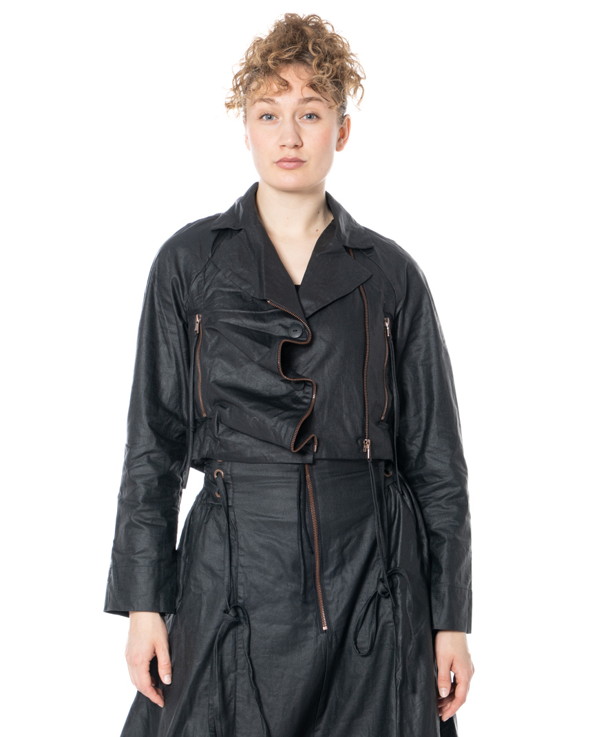 Die Jacke MYRA von studiob3 interpretiert Struktur neu – mit einer avantgardistischen Silhouette und natürlicher Leichtigkeit. Gefertigt aus einem weichen Leinen-Bambus-Gewebe mit Wachs-Effekt-Beschichtung, verbindet sie moderne Eleganz mit haptischer Tiefe.