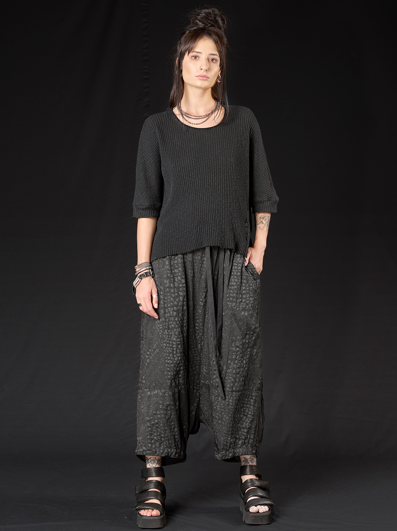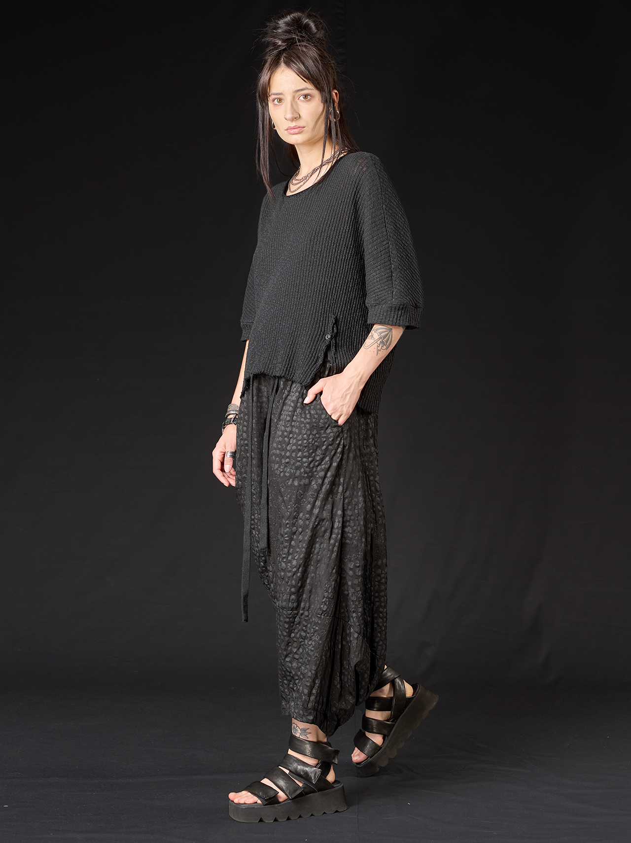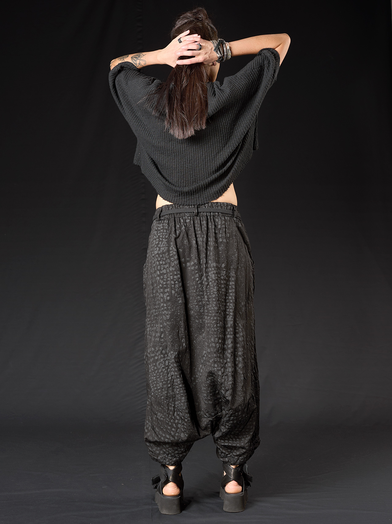 Der tiefe Schritt und der elastische Bund sorgen für Bewegungsfreiheit und Komfort, während Gürtelschlaufen, ein Bindegürtel aus Kordel und Seitentaschen praktische Details bieten. Die charakteristische Silhouette verkörpert studiob3s minimalistische Ästhetik – ausdrucksstark, urban und zugleich mühelos tragbar.