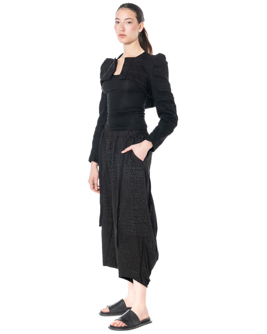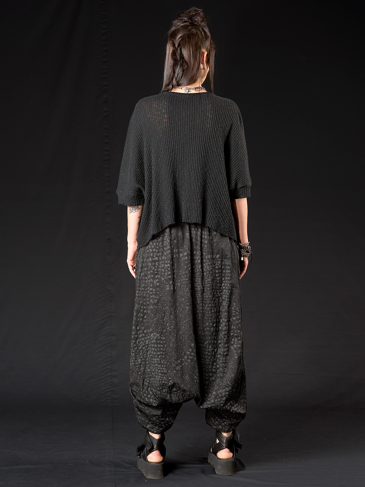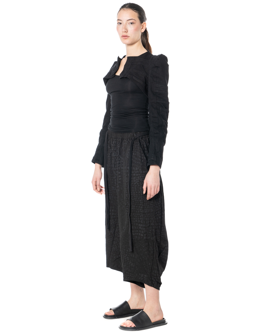 Der tiefe Schritt und der elastische Bund sorgen für Bewegungsfreiheit und Komfort, während Gürtelschlaufen, ein Bindegürtel aus Kordel und Seitentaschen praktische Details bieten. Die charakteristische Silhouette verkörpert studiob3s minimalistische Ästhetik – ausdrucksstark, urban und zugleich mühelos tragbar.