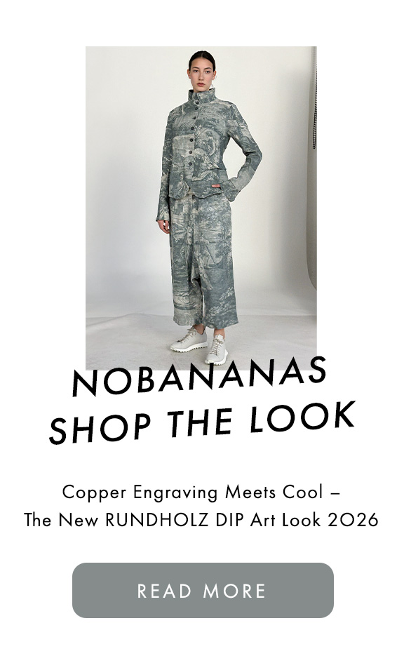The NOBANANAS online store is an exclusive designer fashion hub for adventurous women who are interested in fashion and style. Discover our exceptional fashion labels, which are easy to wear and unique in high quality and design appeal along the whole line. Whether it's annette görtz, HIGH by Claire Campbell, RUNDHOLZ, RUNDHOLZ DIP, RUNDHOLZ BLACK LABEL, studiob3, PURO SECRET, DRKSHDW by Rick Owens, PLEATS PLEASE ISSEY MIYAKE, LA HAINE INSIDE US, KATHARINA HOVMAN, JNBY, HINDAHL & SKUDELNY, Minx or trippen, our exquisite range of labels will surely inspire you!