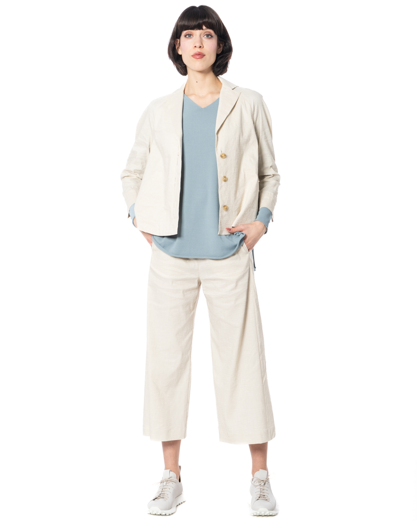 With the pants BINKO annette görtz demonstrates how contemporary tailoring can merge seamlessly with summer ease. The high-waist cut highlights the waist, while the wide, cropped leg creates a refined A-line silhouette – echoing the international runway revival of wide-leg proportions.