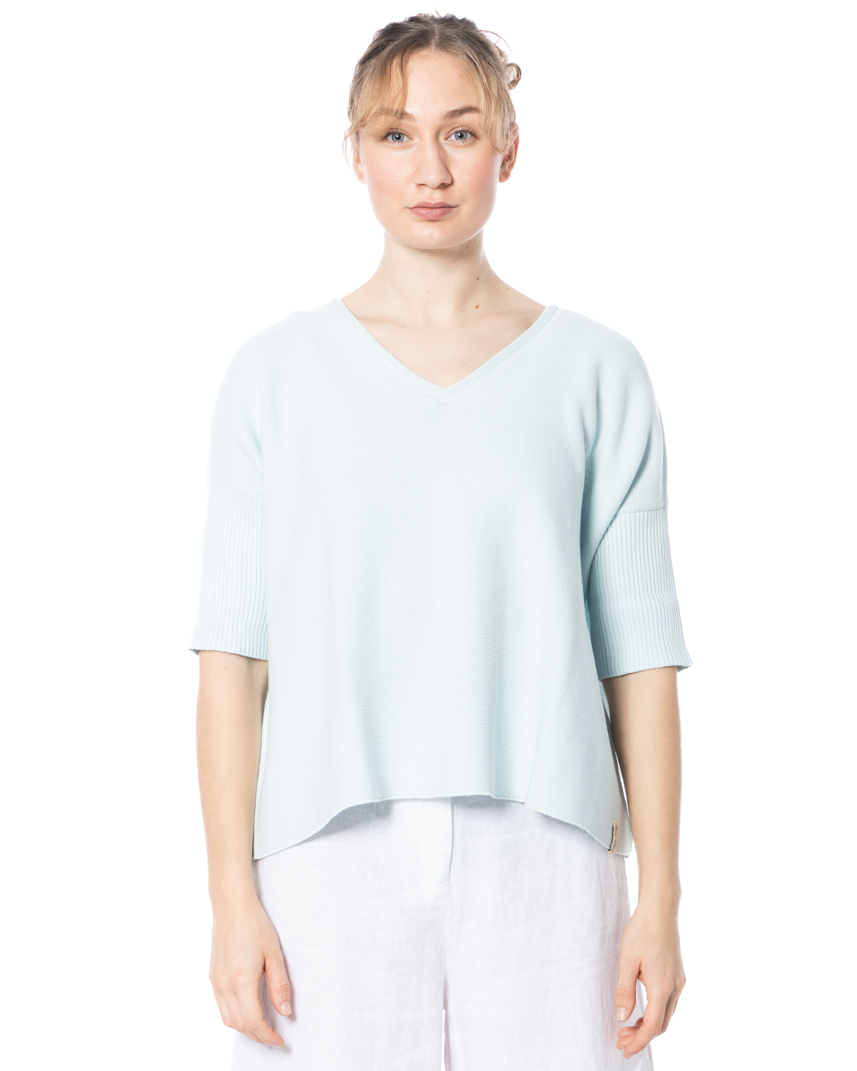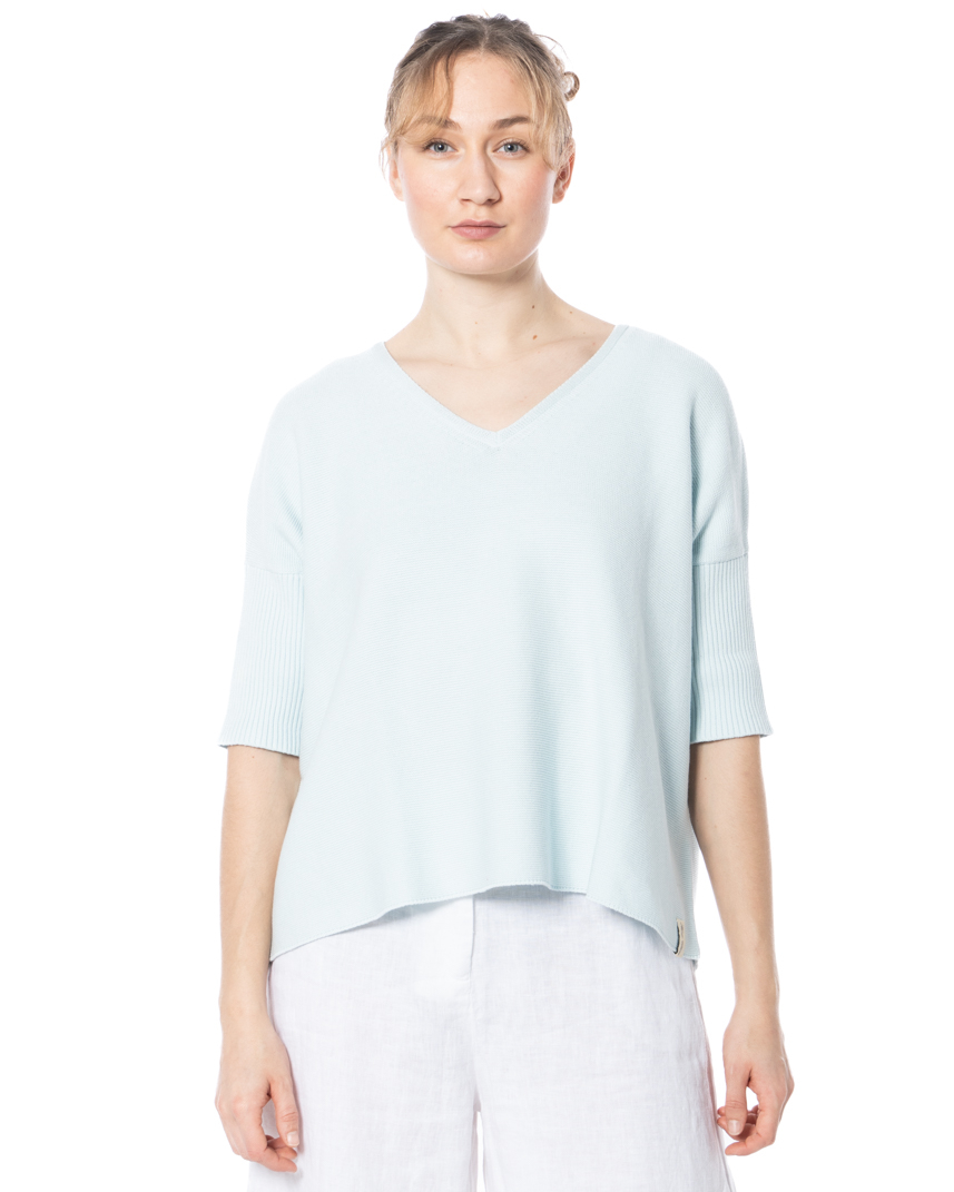 This V-neck jumper by HENRY CHRIST is made of 100% cotton, renowned for its soft, breathable, skin-friendly feel. The lightweight knit fabric has an effortless, fluid drape, making this a sophisticated choice for spring and summer. The boxy, modern cut with shortened sleeves creates a contemporary silhouette, and the V-neckline adds a subtle feminine touch. Side vents provide added freedom of movement and everyday versatility. The fine knit is accentuated with ribbed detailing on the sleeves, which adds subtle texture to the design. This model is ideal for those who value comfort and a sleek, modern aesthetic.