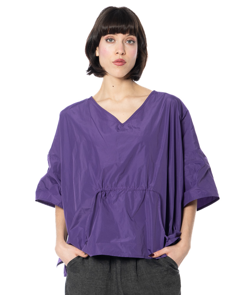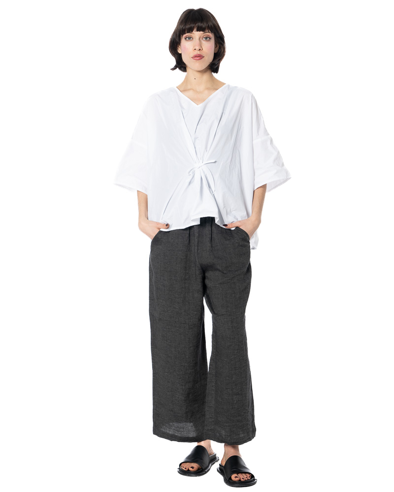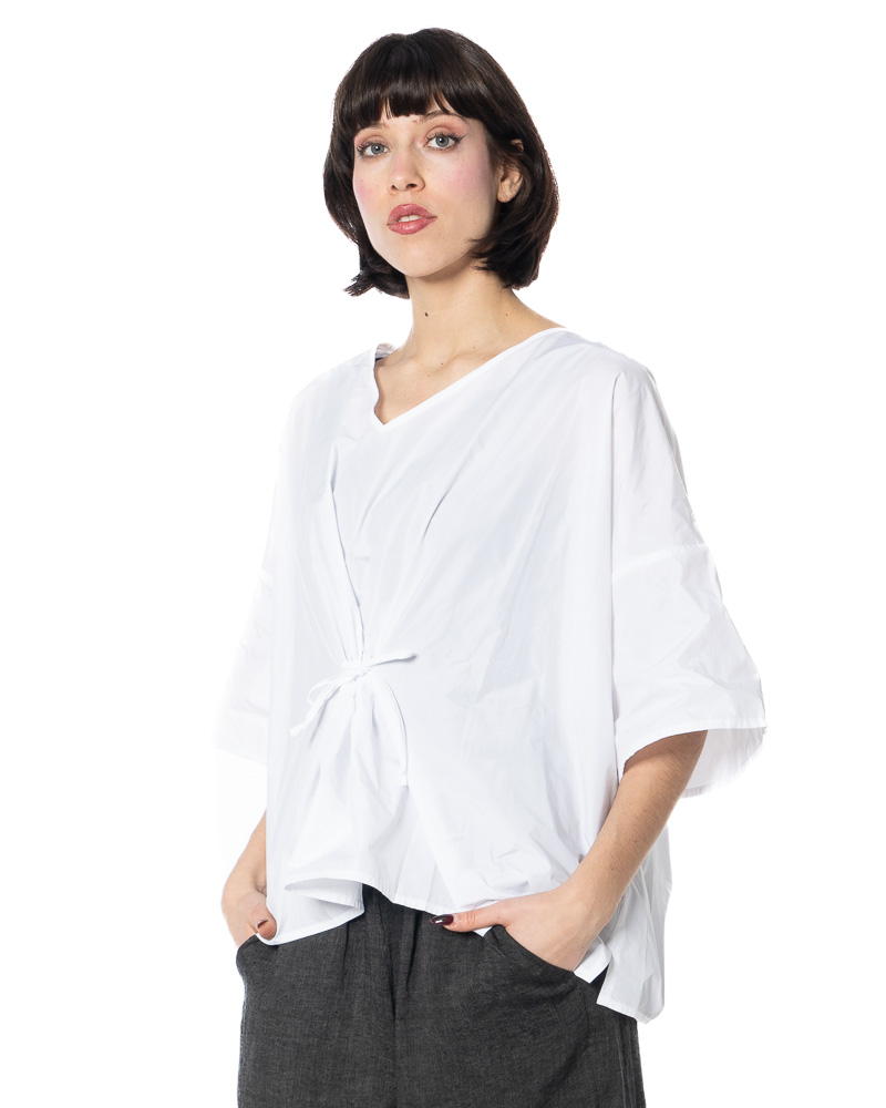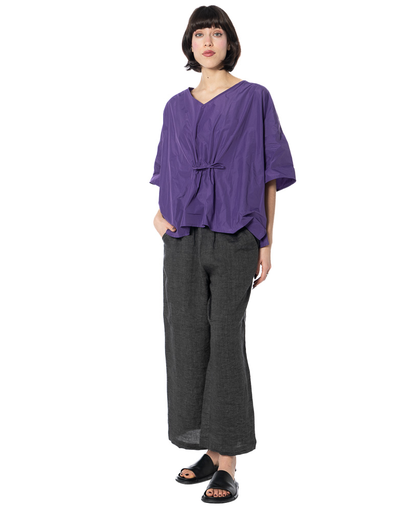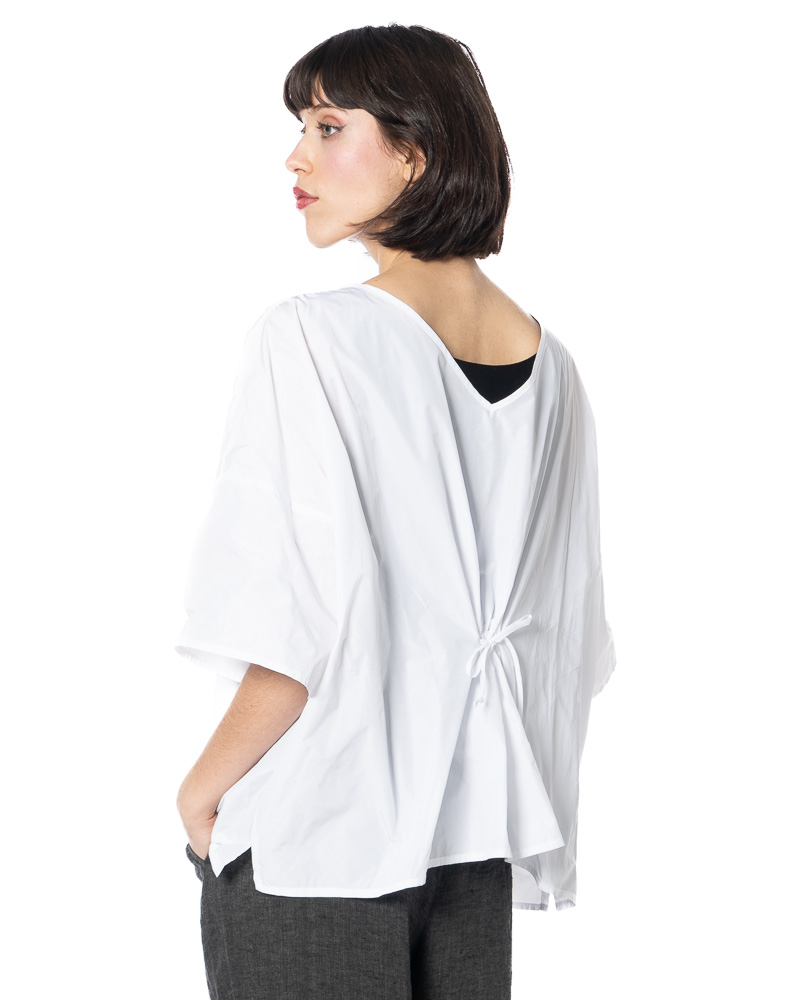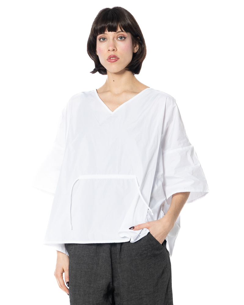 The width-adjustable top by HINDAHL & SKUDELNY impresses with its clean, minimalist look and well-thought-out functionality. The model features a V-neckline that creates a subtle opening at the décolleté and can be combined in many different ways. The half to three-quarter sleeves provide comfortable coverage and are particularly suitable for the transition period and warm days in spring and summer. A key feature is the drawstring at the waist, which allows you to adjust the width to suit your individual needs – so you can decide for yourself whether you want the top to fall loosely or fit more closely to your figure. The loose, boxy cut allows for freedom of movement and emphasizes the purist character of the design. The workmanship and choice of materials are designed for everyday wear and comfort, making the model comfortable to wear even on long days.