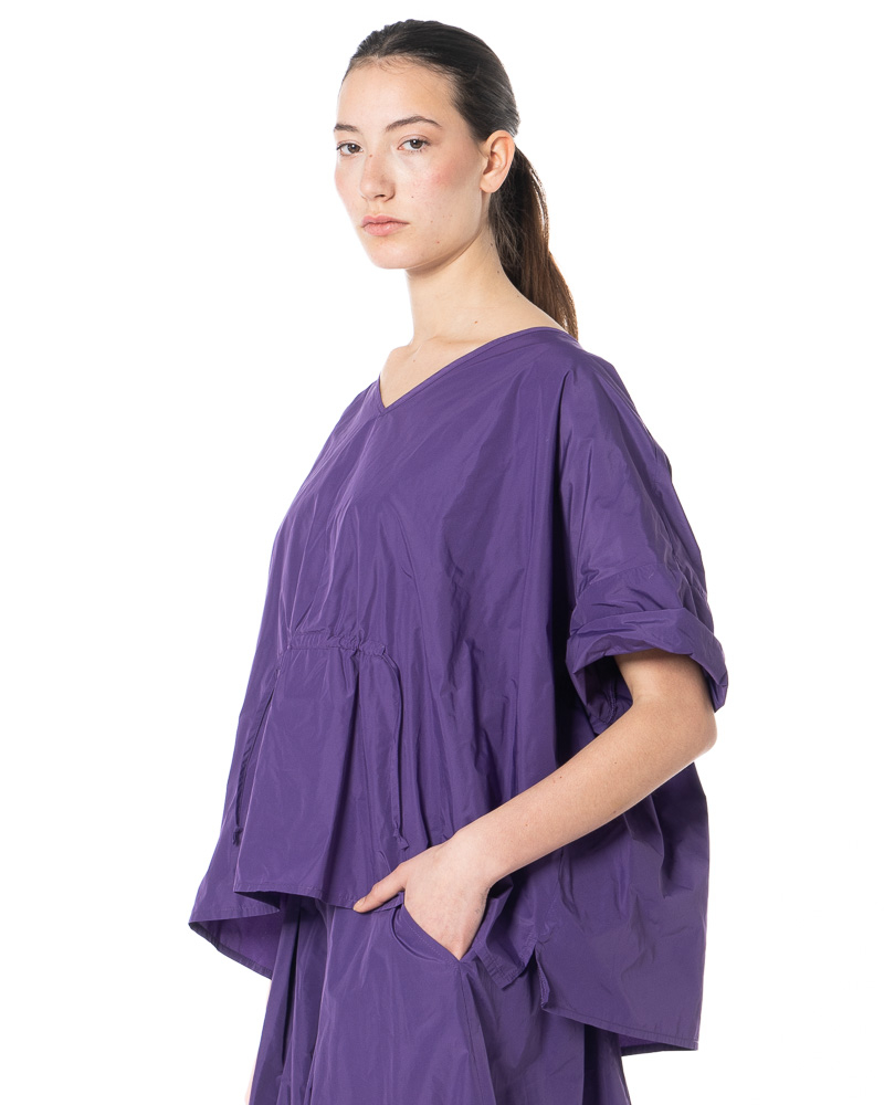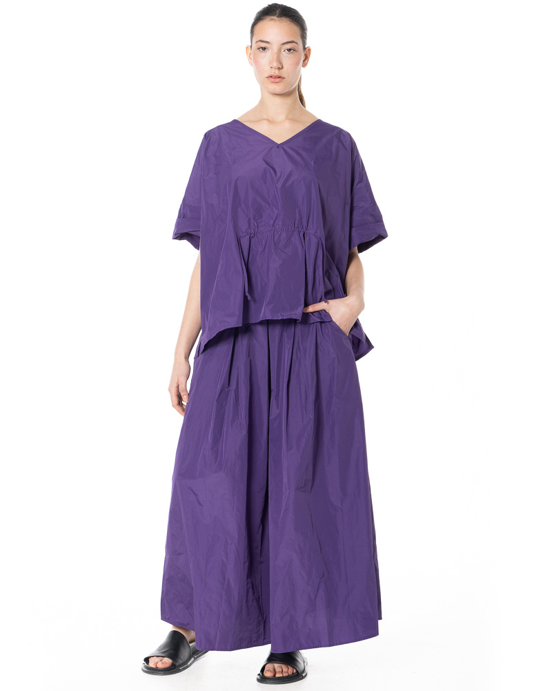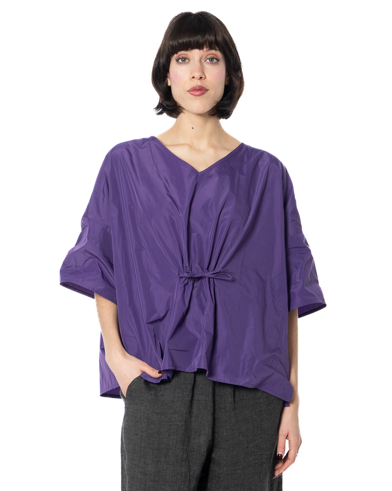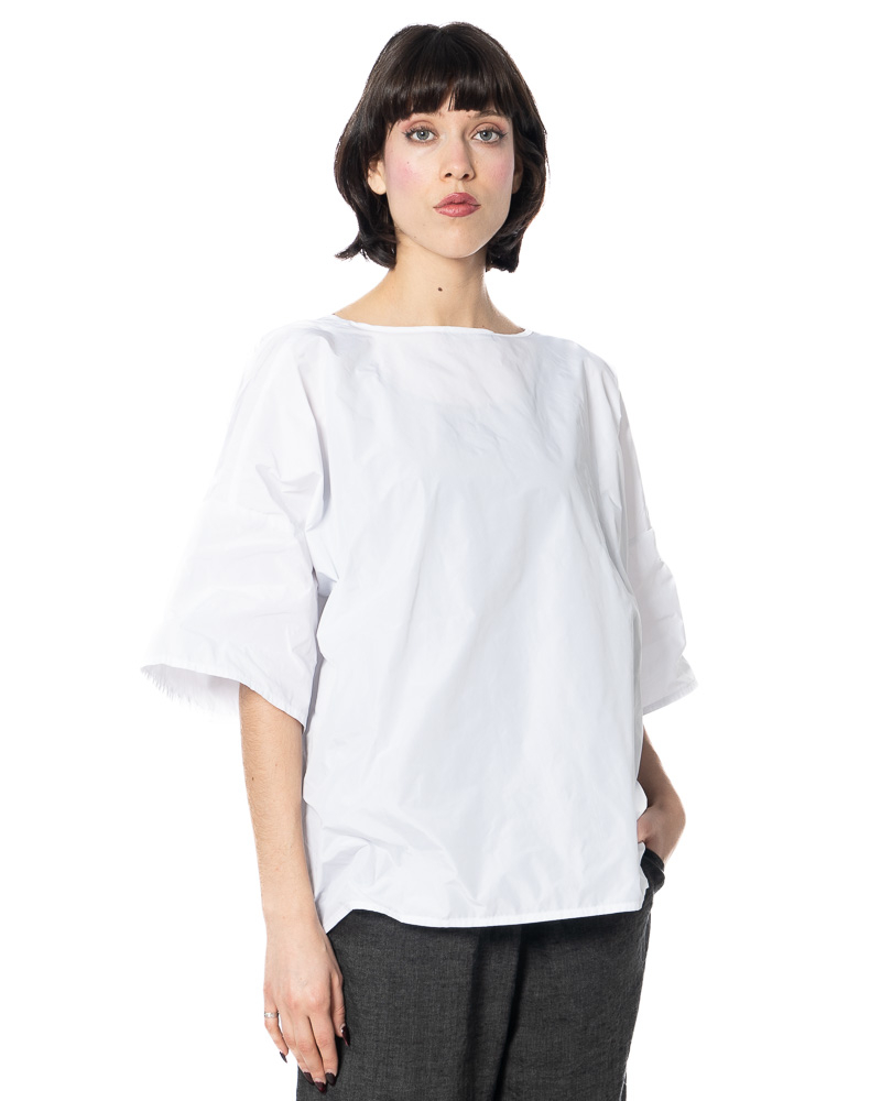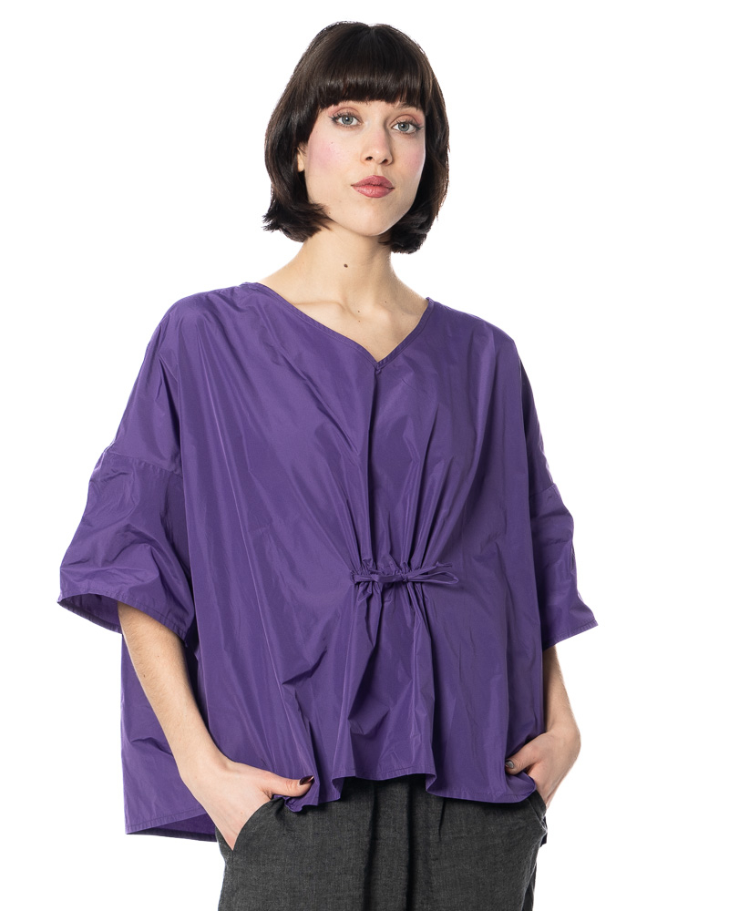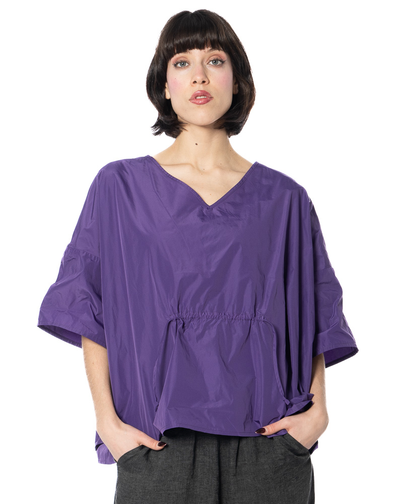 The width-adjustable top by HINDAHL & SKUDELNY impresses with its clean, minimalist look and well-thought-out functionality. The model features a V-neckline that creates a subtle opening at the décolleté and can be combined in many different ways. The half to three-quarter sleeves provide comfortable coverage and are particularly suitable for the transition period and warm days in spring and summer. A key feature is the drawstring at the waist, which allows you to adjust the width to suit your individual needs – so you can decide for yourself whether you want the top to fall loosely or fit more closely to your figure. The loose, boxy cut allows for freedom of movement and emphasizes the purist character of the design. The workmanship and choice of materials are designed for everyday wear and comfort, making the model comfortable to wear even on long days.
