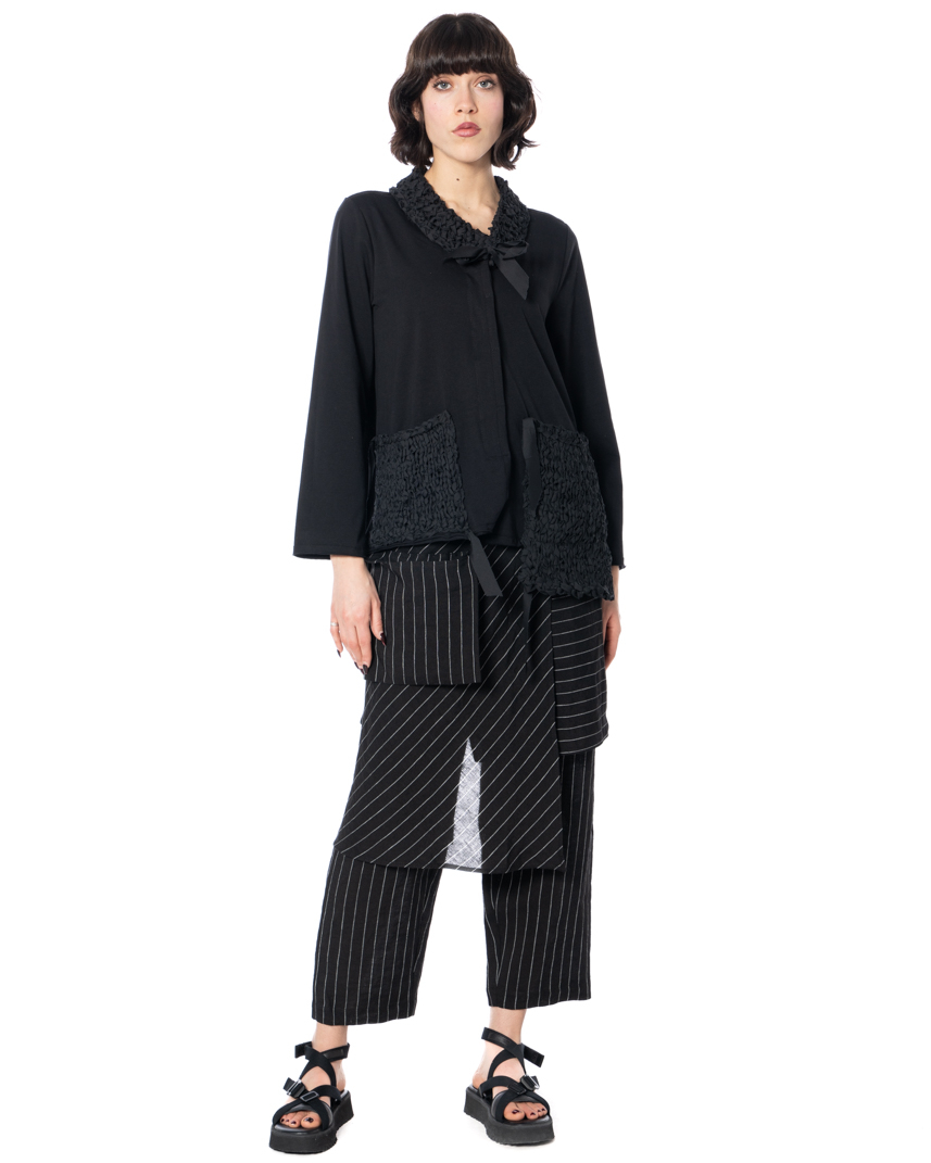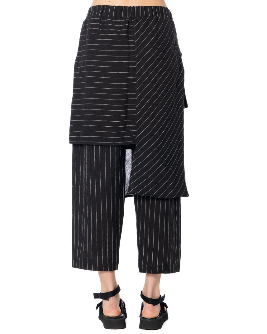 These linen pants by the designer label KEDZIOREK feature a striking pinstripe motif with delicate linework for a modern twist. Made from 100% linen, they offer a pleasantly light feel, which is especially beneficial during the spring and summer. The relaxed, cropped silhouette ensures ease of movement and underscores the piece's effortless attitude. A signature detail is the skirt-over-pants effect, which gives the garment an experimental, Japanese-inspired aesthetic. The gently dropped crotch enhances the relaxed shape, and the straight, slightly cropped leg completes the contemporary look. This statement piece stands out from classic styles and appeals to fashion-forward women who value exceptional design.