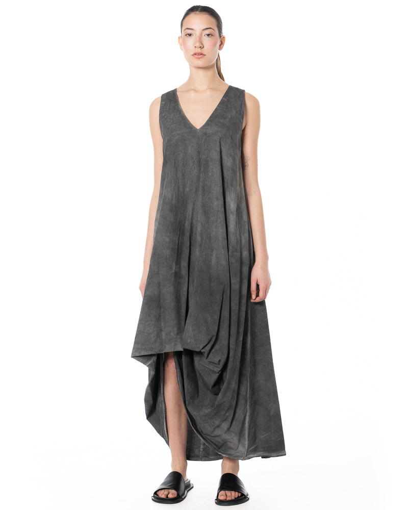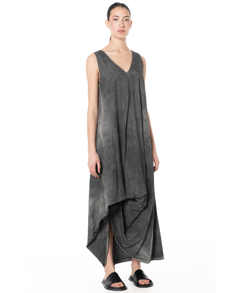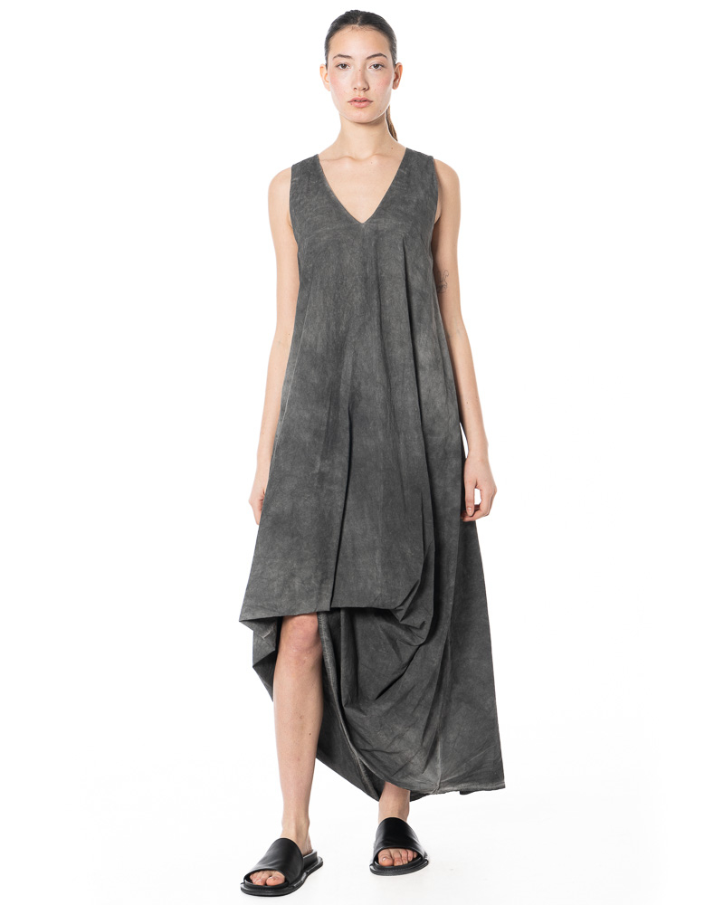 The LA HAINE INSIDE US, cotton dress is made of piece-dyed cotton gabardine that has a matte, slightly textured finish and a refined feel. Front draping creates a striking silhouette and an intriguing line that flows across the bodice and waist. A V-neckline accentuates the modern cut and lends itself to versatile styling with a variety of accessories. The detachable sash belt allows you to accentuate the waist or wear the dress with effortless ease; true to your personal style. Back zipper for easy on/off while remaining out of sight. This dress by LA HAINE INSIDE US is perfect for the spring/summer season because the breathable fabric keeps you comfortable even on warmer days. This model offers a thoughtful blend of functional details and clean, refined lines.