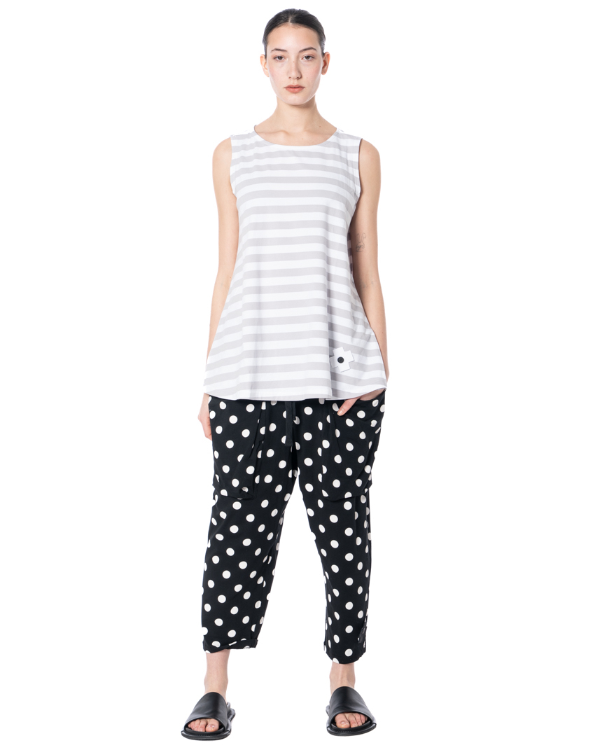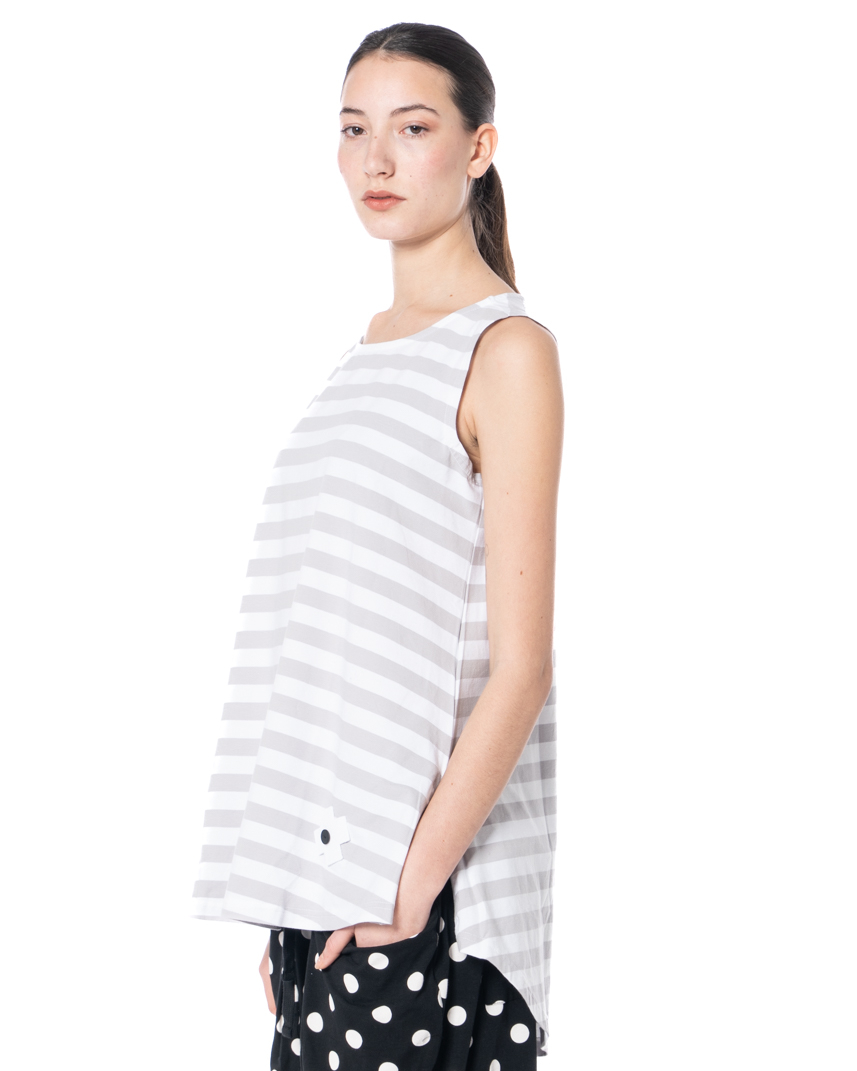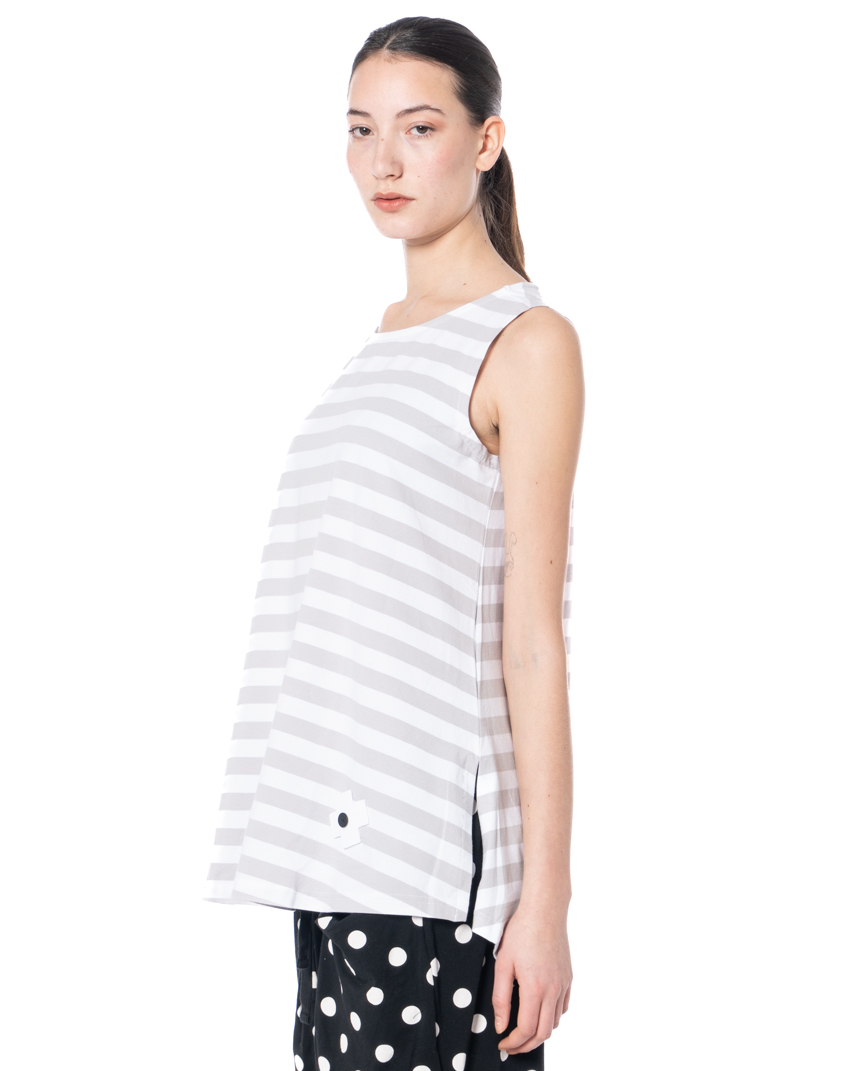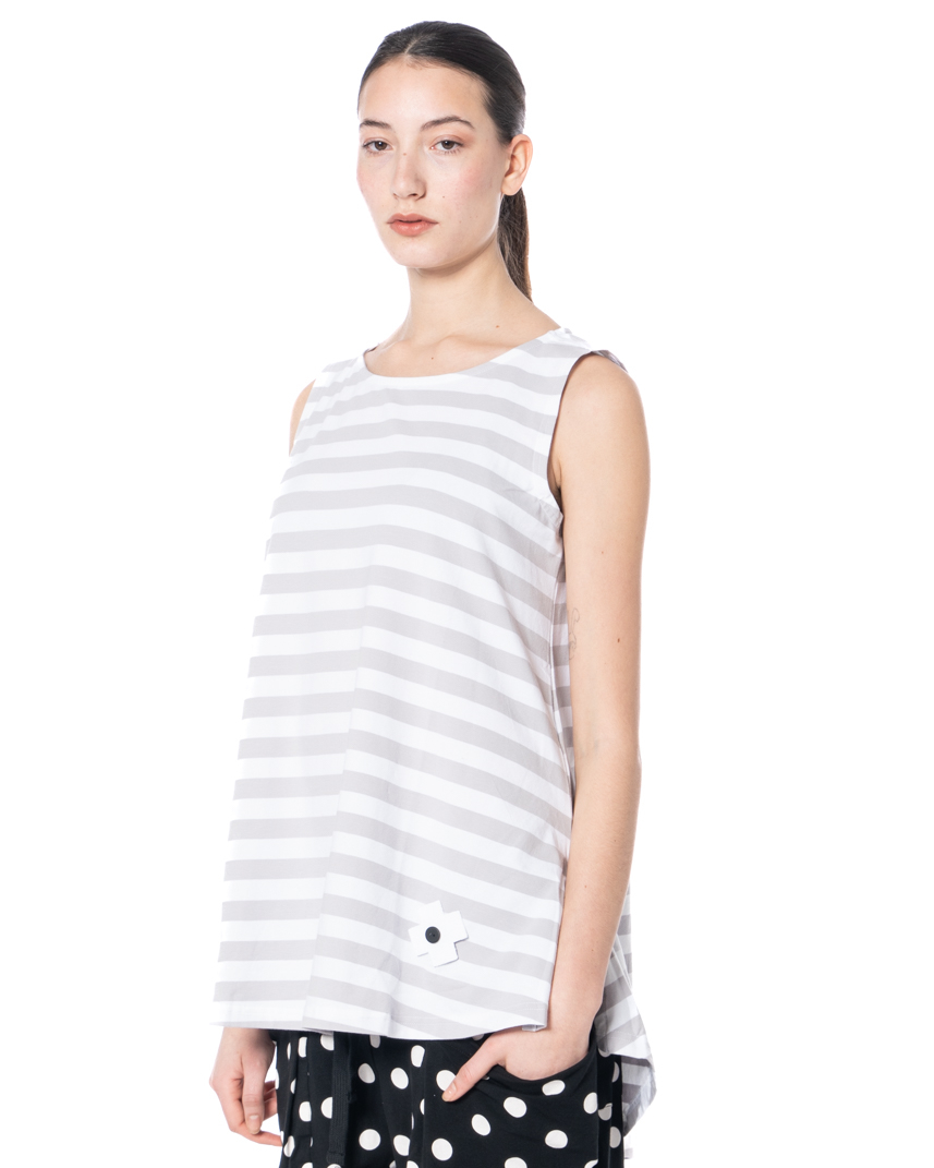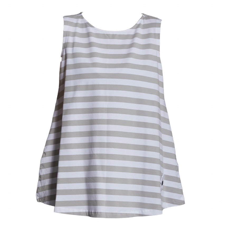The PLUSLAVIE PLÜ Top is a classic shirt specially created for the spring/summer season. Made from a lightweight cotton jersey, it feels delightful against the skin and offers an airy, effortless fit. The sleeveless, scoop-neck design provides freedom of movement and is perfect for warm days. The all-over white and grey stripes give the piece a crisp, graphic look, while the iconic Plus patch adds a subtle branding accent. The flared A-line creates a flattering silhouette and a comfortable fit that is easy to style. Meticulous craftsmanship and a distinctive pattern make this top a versatile addition to your summer wardrobe. This PLUSLAVIE PLÜ piece impresses with its thoughtful cut and elevated materials. It's perfect for those who value comfort and understated details.