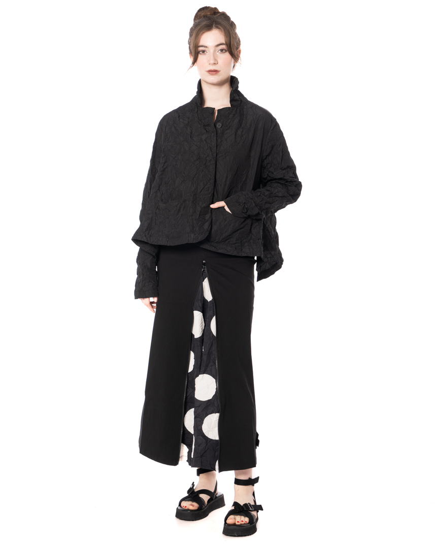 The black taffeta T HOMEY jacket by PLUSLAVIE PLÜ is a summer-ready take on a beloved classic. Crafted from lightweight taffeta, this piece has an effortless feel and a subtle crinkled finish that gives the fabric a distinctive texture. Cut in a flared A-line that falls airily for freedom of movement. Straight-shaped sleeves refine the silhouette while the elegantly sculpted collar completes the look. A front button placket makes it easy to open and close, so you can easily adapt to changing spring and summer temperatures. Two front pockets for added convenience. In timeless black, the jacket goes with everything and underscores the pared-down, purist character of the piece.