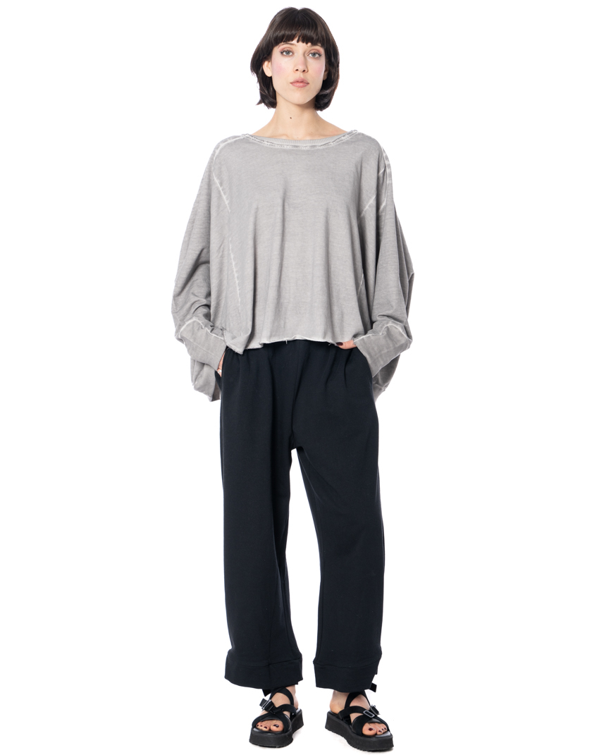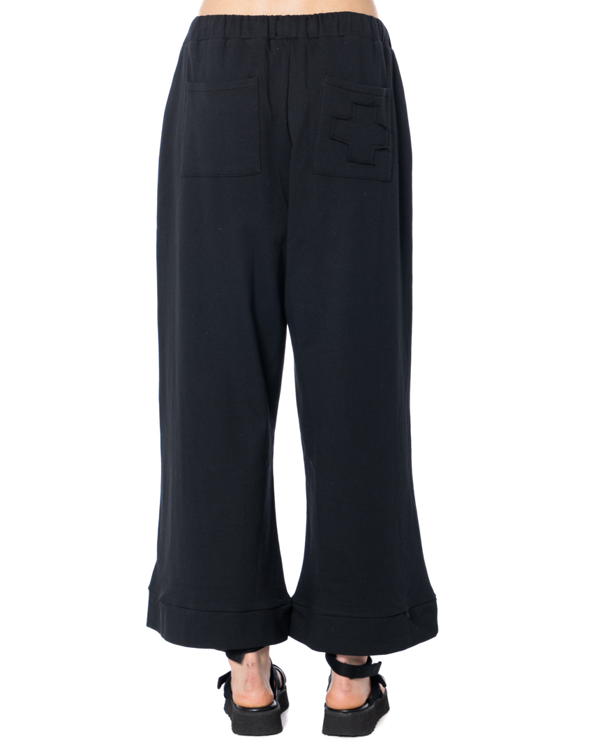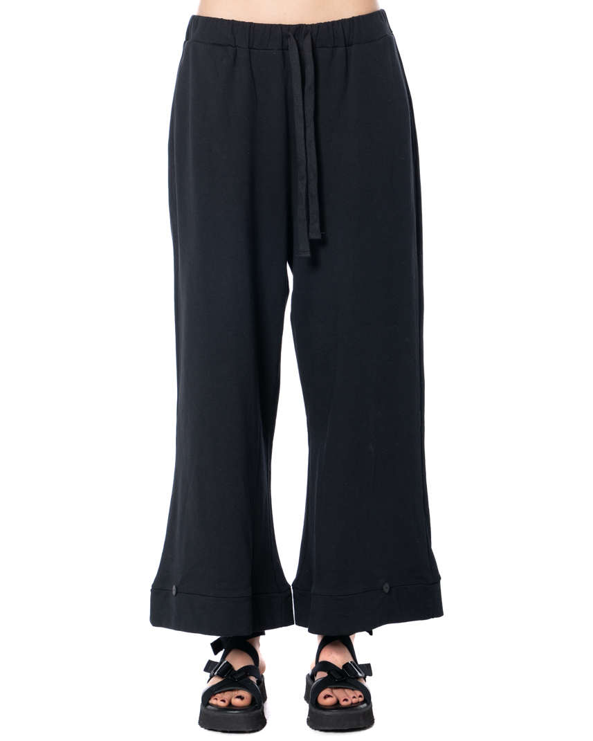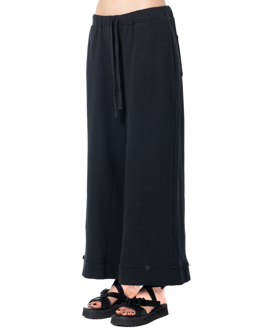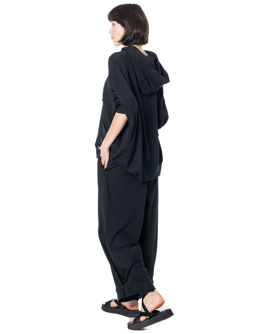 The elegant sweathose PLÜ PANT from Denise Frölich’s label PLUSLAVIE PLÜ debuts as an innovative pants creation that combines classic codes with modern finesse. Crafted from soft cotton jersey in a bold black, it offers a smooth finish and feather-light wear; ideal for those who want comfort with style. A Marlene-inspired shape creates a fluid silhouette, while extra-long, wide legs offer freedom of movement and a striking line. Elastic waistband for a flexible fit that adjusts to your needs. Very practical: The Magic Buttons at the hems: With just a few easy adjustments, you can button the legs of our PLÜ PANT sweatpants tighter or shorter — letting you change up the look in no time. This detail makes the pants a versatile companion for countless occasions.