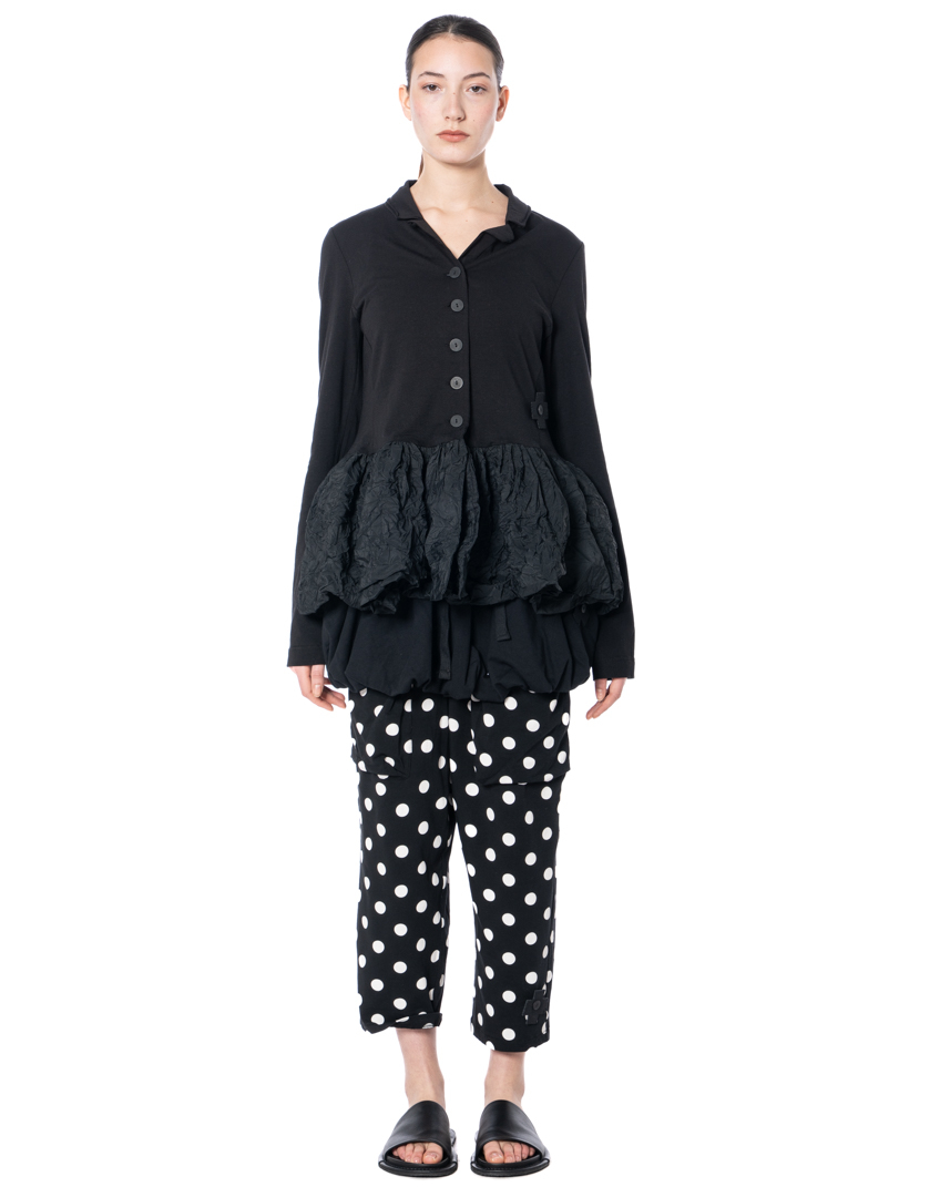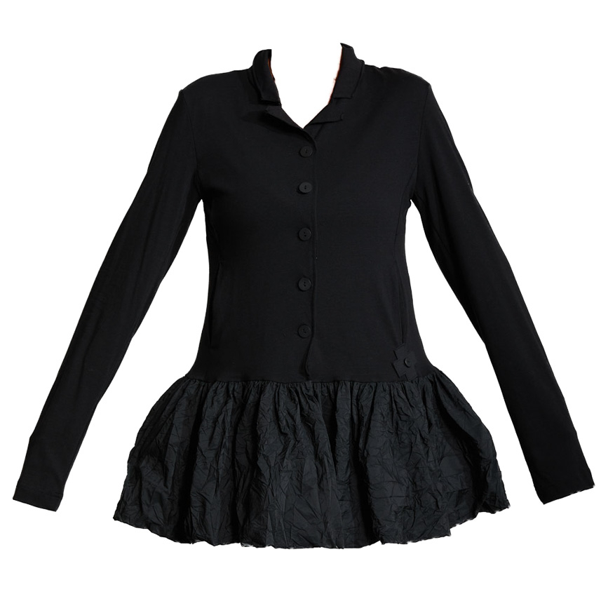 The PLUSLAVIE T jacket with taffeta peplum makes a poised appearance as a uniquely interpreted blazer for the spring/summer season. Crafted from sumptuously soft jersey, the slim, elongated cut creates a modern silhouette. The classic black palette allows for versatile styling, while the slim sleeves create a contoured fit. Discreet collar and front button placket accentuate clean lines. The signature feminine taffeta peplum at the hem provides the unmistakable PLUSLAVIE PLÜ look and adds a playful accent without being overpowering. Meticulous construction-precise stitching and refined fabric selection-ensures freedom of movement and lasting shape. This model appeals to women who value individual details and a distinctive aesthetic.
