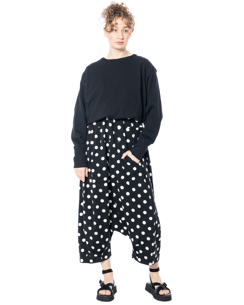The jersey jumpsuit by the designer label PLUSLAVIE PLÜ impresses with its striking look and well-thought-out choice of materials. It is made of soft cotton jersey, feels pleasant to the touch, and is ideal for the warm season. The black base fabric is covered with white all-over dots, giving the model its characteristic polka dot design. The extra-deep crotch and cropped legs ensure a modern, casual fit and guarantee freedom of movement. Practical details such as the patch kangaroo pocket on the front, side pockets, and patch back pockets offer functional storage options. The round neckline emphasizes the simple lines, while the iconic Plus patch gives the jersey jumpsuit with dots by PLUSLAVIE PLÜ a distinctive accent.