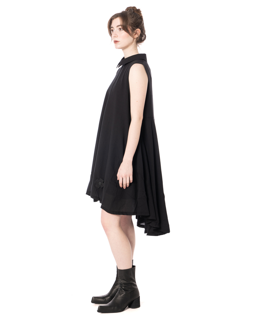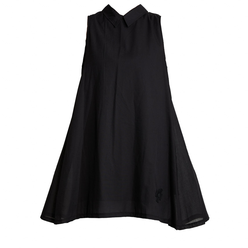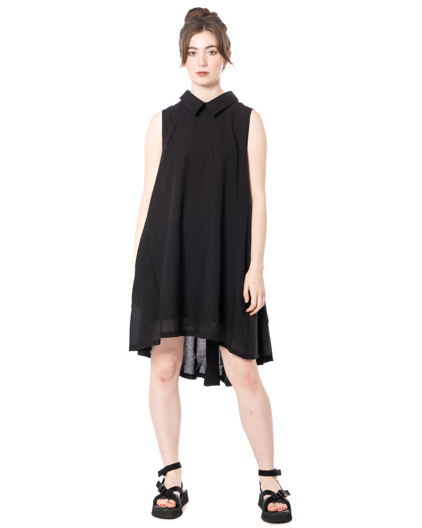 The TUNIC TOP cotton wool tunic by PLUSLAVIE PLÜ impresses with a modern, functional shape that has been specially designed for the warm season. Crafted from a double-layered cotton voile, the tunic offers a beautifully lightweight feel while remaining opaque. The fabric adds a breezy texture that's especially appreciated on warm days. An extended back hem creates a dynamic silhouette, while the flared A-line ensures a comfortable fit. A sharp pointed collar adds a clean, graphic accent that highlights the label's signature design. Presented in classic black and finished with the iconic Plus patch, it bears a discreet signature. The sleeveless construction makes this piece ideal for spring and summer and allows for effortless styling.