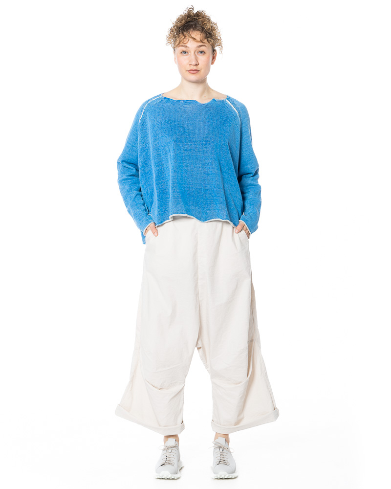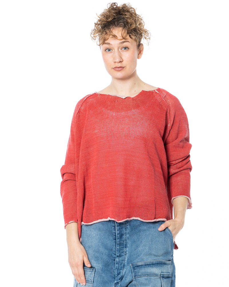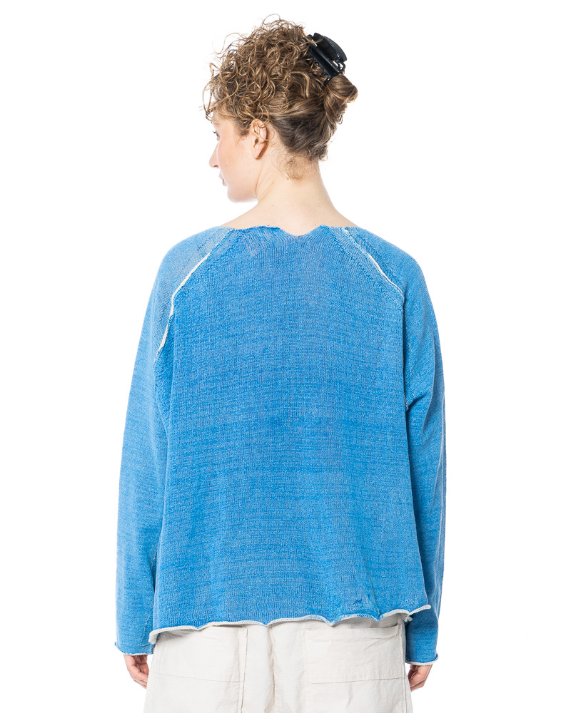 The fine linen-cotton jumper from the RUNDHOLZ Spring/Summer collection balances relaxed nonchalance with subtle refinement. The fine linen structure, enhanced by a delicate coating, creates a soft, tactile surface that gently follows the silhouette while adding depth and character. Rolled hem edges introduce an intentional break in formality, lending the design an understated, contemporary edge. Wide, flowing raglan sleeves and a relaxed fit emphasize movement and airiness, resulting in a look that feels effortless yet thoughtfully composed.