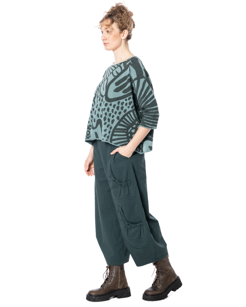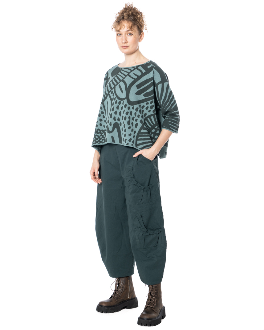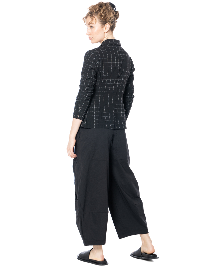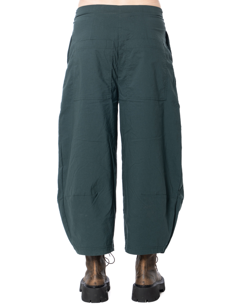 This banana-shaped pants are defined by their sculptural, curved silhouette that creates a distinctive and contemporary shape. The characteristic banana form is emphasized by carefully placed darts, adding structure and subtle volume to the leg. The material blend offers a balanced feel, combining durability with flexibility for comfortable everyday wear.