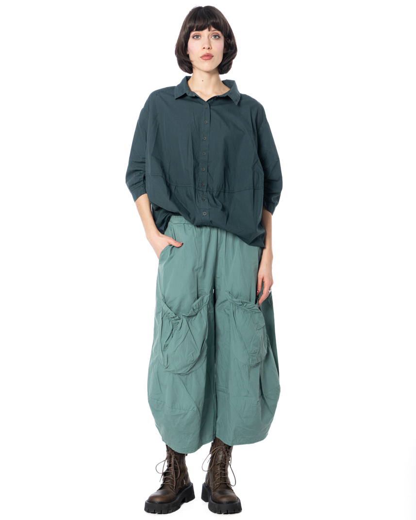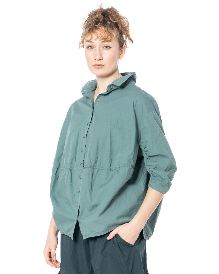 This relaxed-fit blouse by the designer label RUNDHOLZ BLACK LABEL offers generous freedom of movement. A classic shirt collar and full-length button placket provide a structured finish, and cropped sleeves give it a modern twist. The lightweight fabric feels soft against the skin, draping fluidly for an airy feel — perfect for warm spring and summer days. Meticulous craftsmanship ensures an even fabric texture and precise seams. The understated, timeless design makes it easy to pair with skinny trousers, skirts, or casual jeans. It is ideal for those who value comfort and versatility without compromising on quality craftsmanship.