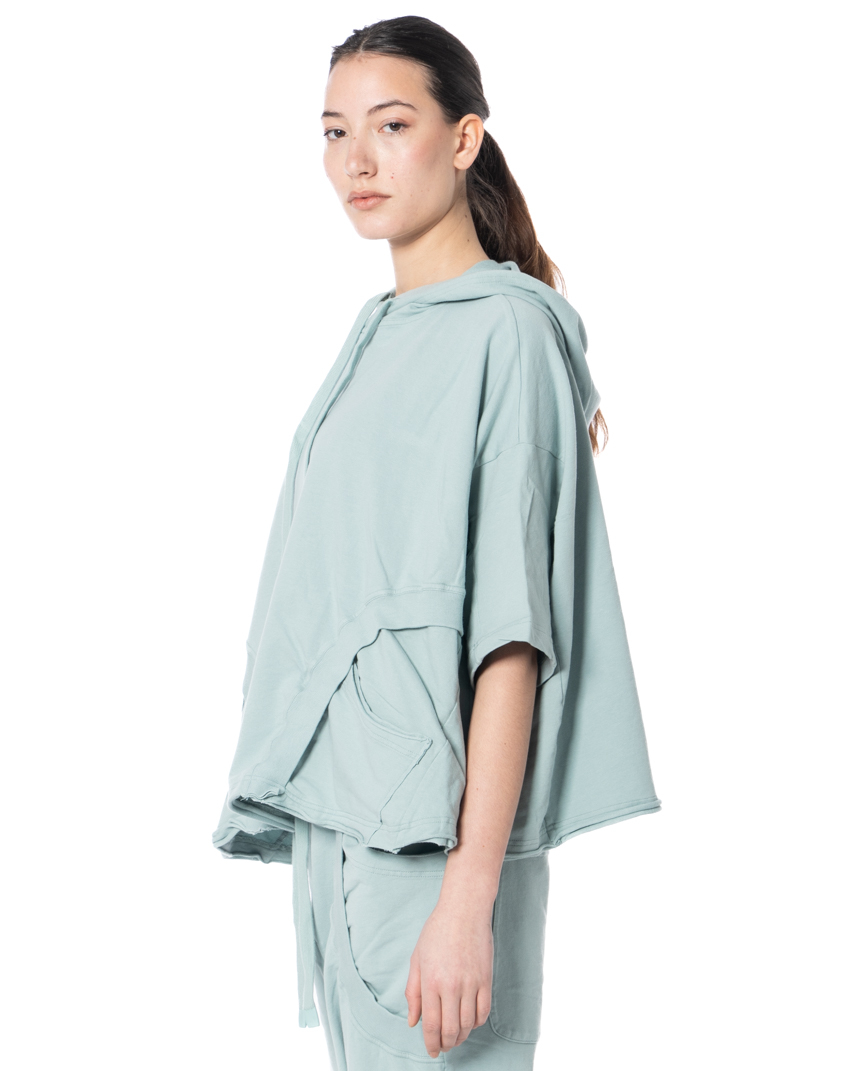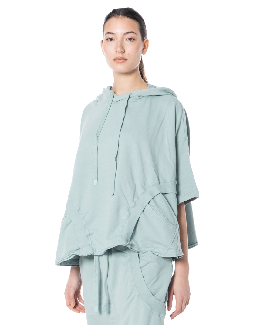 The hood with drawstring and cord fastening introduces a sporty street-inflected edge, while the short sleeves break the silhouette in a striking way, making this piece ideal for transseasonal layering. The straight hemline ensures a clean, balanced drape — and then there is this small, poetic detail: the little flower at the hem. Subtle. Ironic. Unmistakably RUNDHOLZ.
