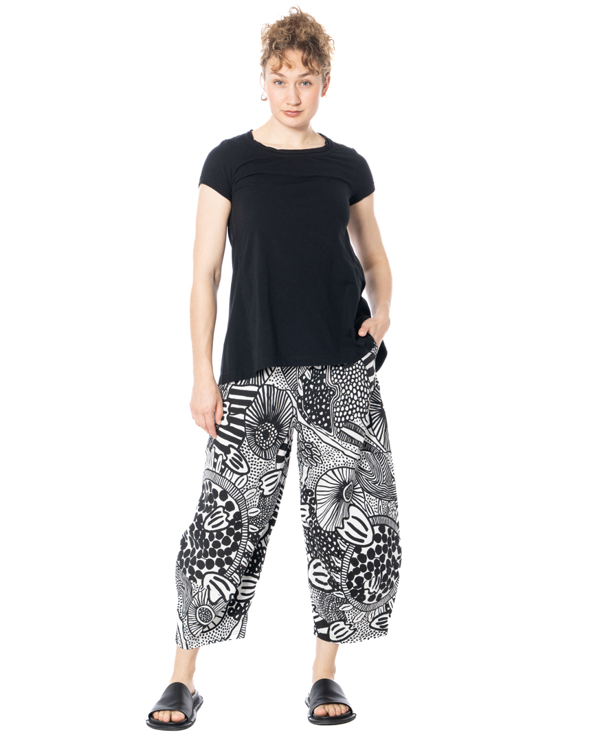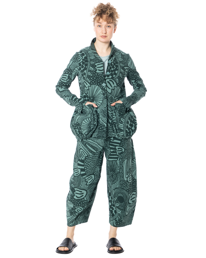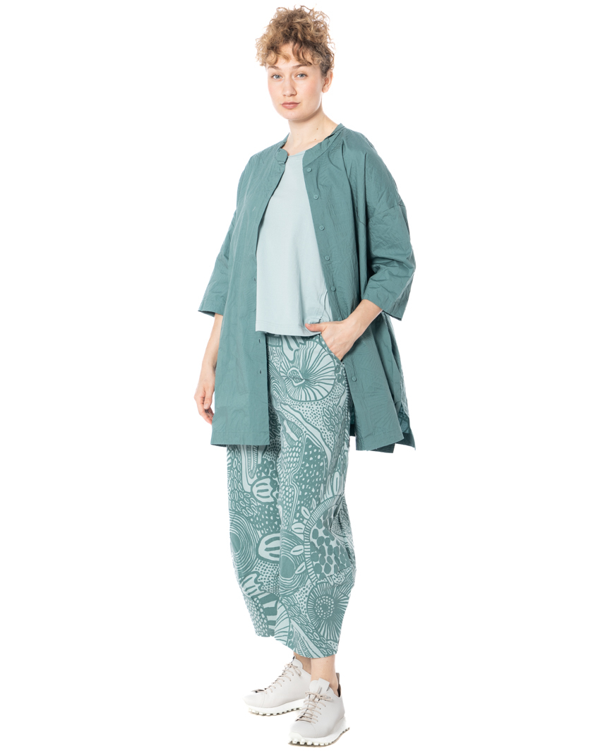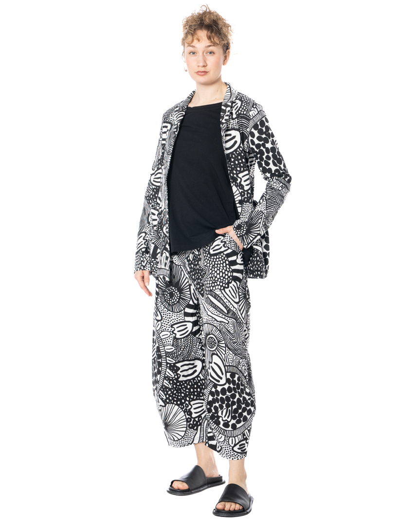 Sometimes fashion begins in the detail. And sometimes in the microcosm. These iconic RUNDHOLZ BLACK LABEL pants feature an allover print inspired by magnified cellular structures and organic formations — a microscopic world translated into modern design. Lines, dots, and subtle floral echoes merge into a composition that feels almost scientific, yet distinctly artistic. Fluid stretch viscose brings movement to the wide silhouette. The fabric drapes effortlessly, responds to every step, and ensures exceptional comfort with its natural flexibility. Lightweight against the skin, adaptable to everyday life.