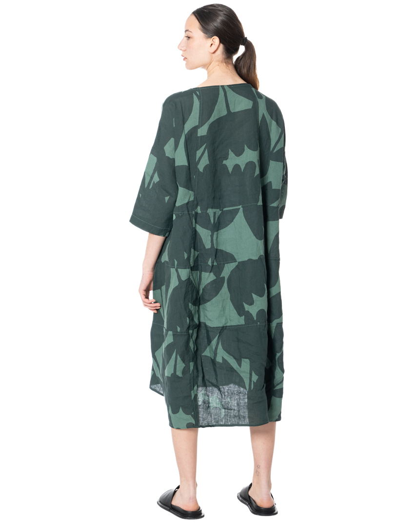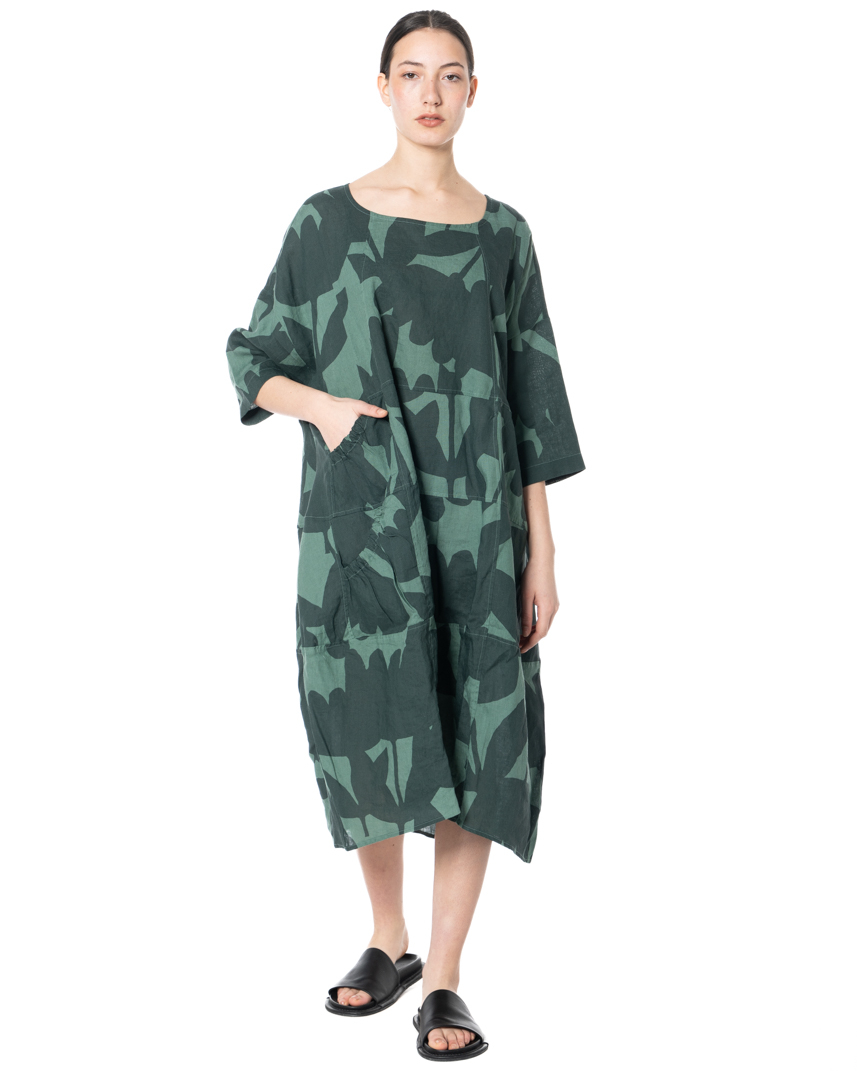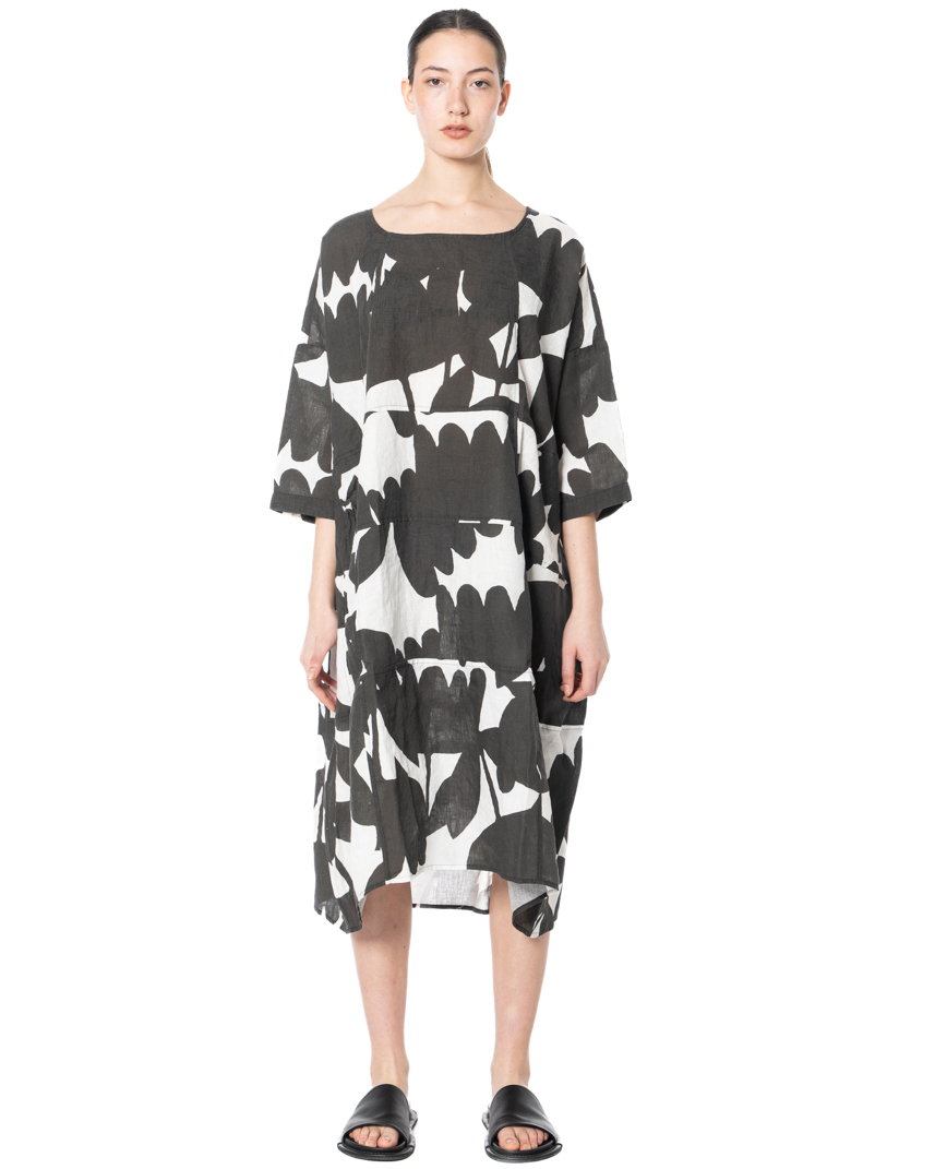 Floral graphics in summer linen! This iconic dress reimagines the classic flower print as bold, abstract silhouettes that sweep across the fabric like oversized botanical shadows. Graphic, artistic and unmistakably modern, the relaxed, sculptural cut adds effortless volume, while the fluid fabric and two softly gathered side pockets integrate playfully into the design. The characteristic wide silhouette is supported by carefully placed seams, giving the dress structure while allowing the fabric to move freely. Pure linen ensures a light, breathable feel — perfect for warm days when fashion is meant to feel effortless.