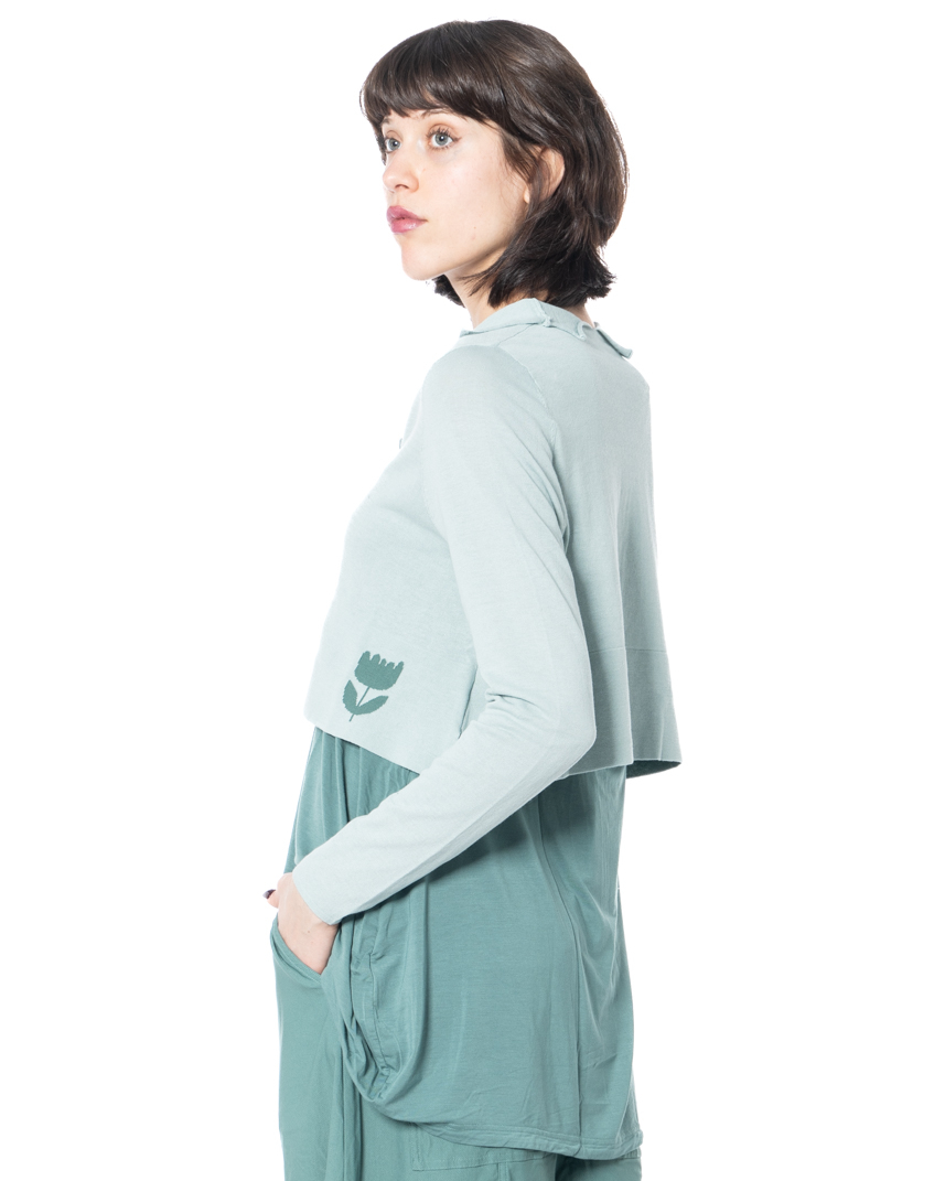 This short cardigan by RUNDHOLZ BLACK LABEL boasts a modern, minimalist aesthetic and the brand's signature design. The cropped silhouette features a relaxed, slightly boxy cut for an effortless and comfortable fit. The front button placket allows you to put the jacket on and take it off easily, while the long sleeves provide extra coverage on cooler days. Made from lightweight, soft fabric, it's ideal for transitional seasons and summer evenings when an extra layer is needed. A small decorative motif at the hem adds a subtle accent to the timeless urban aesthetic. Naturally versatile, this cardigan will work seamlessly with both casual looks and sophisticated ensembles.
