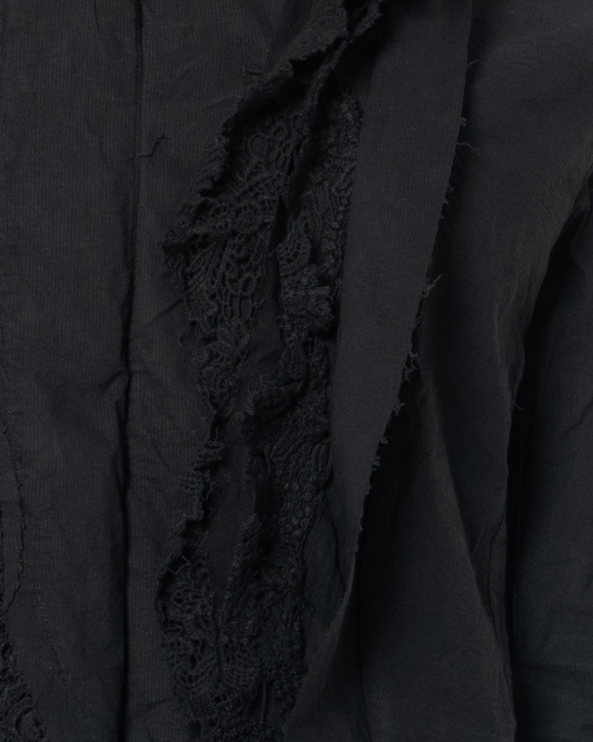 - Double-layered lace volants at lapel and sleeves