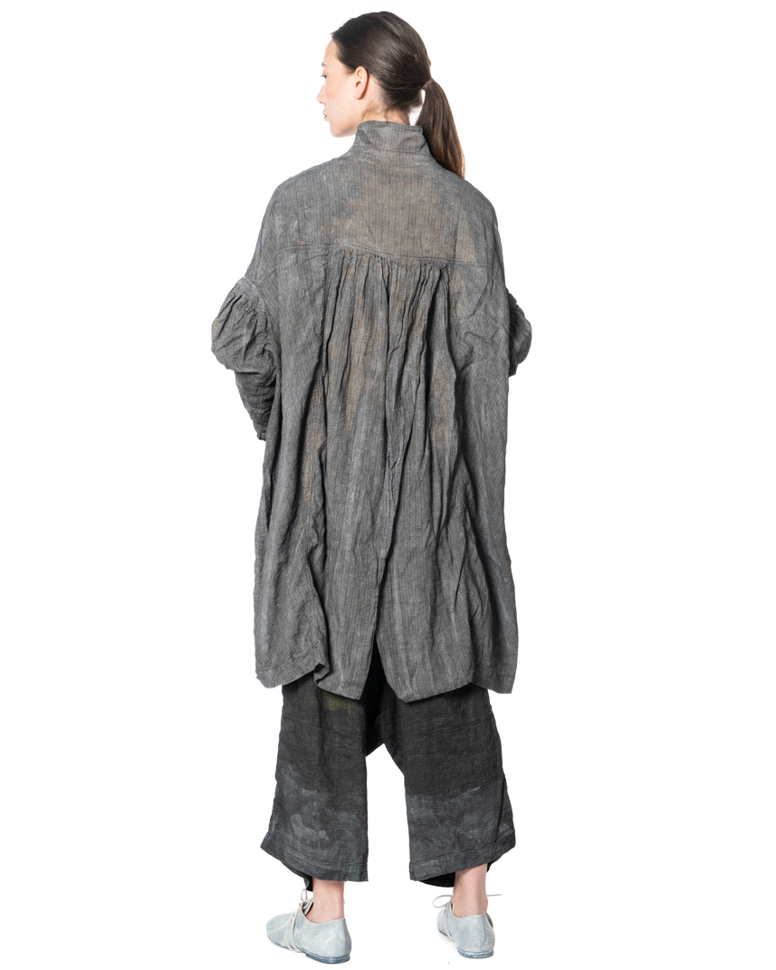 Industrial Chic in Textile Form Drawing inspiration from rough fog banks, morning mist, and layers of concrete, this extravagant coat by RUNDHOLZ DIP combines avant-garde design with mystical colors. Its thoughtful design reveals its strength when in motion. The back of the coat opens and flips when walking, allowing air to circulate and creating space. The slightly gathered sleeves at the shoulders emphasize the coat's presence. In terms of material, flowing viscose meets structured linen — a play of softness and texture. The fabric moves with the body and refracts light with a matte finish.