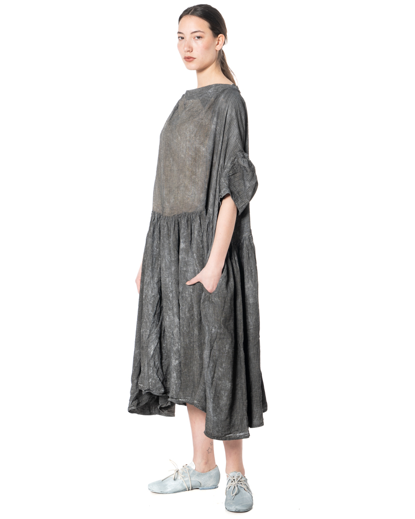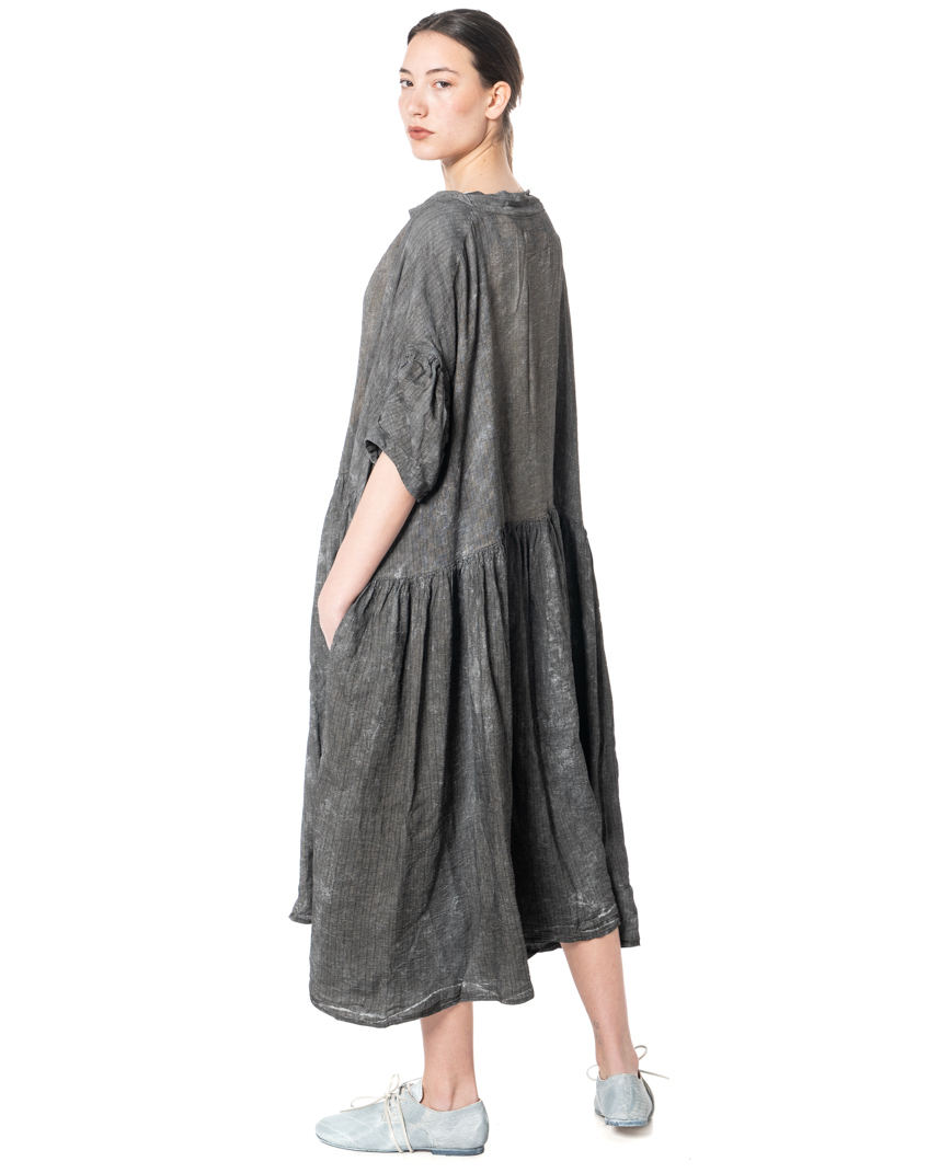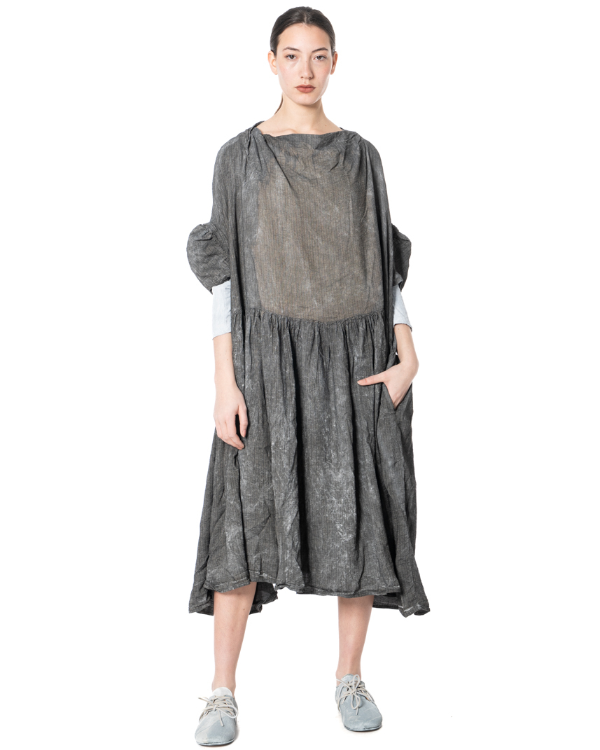Fog instead of stardust. This RUNDHOLZ DIP dress evokes misty mornings, soft colors, and the mysterious beauty that doesn't need to be loud. The washed-out linen looks as if it has been dipped in fog—soft and diffuse with organic shades that create depth and give each dress its unique design. The loose-fitting cut gives the dress movement and airiness. Gently flowing at the top, it transitions into a flowing width at the bottom, creating a silhouette that breathes freedom. Oversized sleeves with fine ruffles, a delicate dividing seam, and an asymmetrically swinging hem give the design its characteristic RUNDHOLZ signature: casual, slightly raw, and deliberately imperfect.