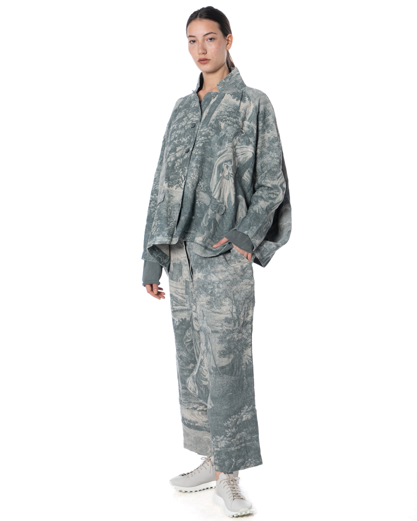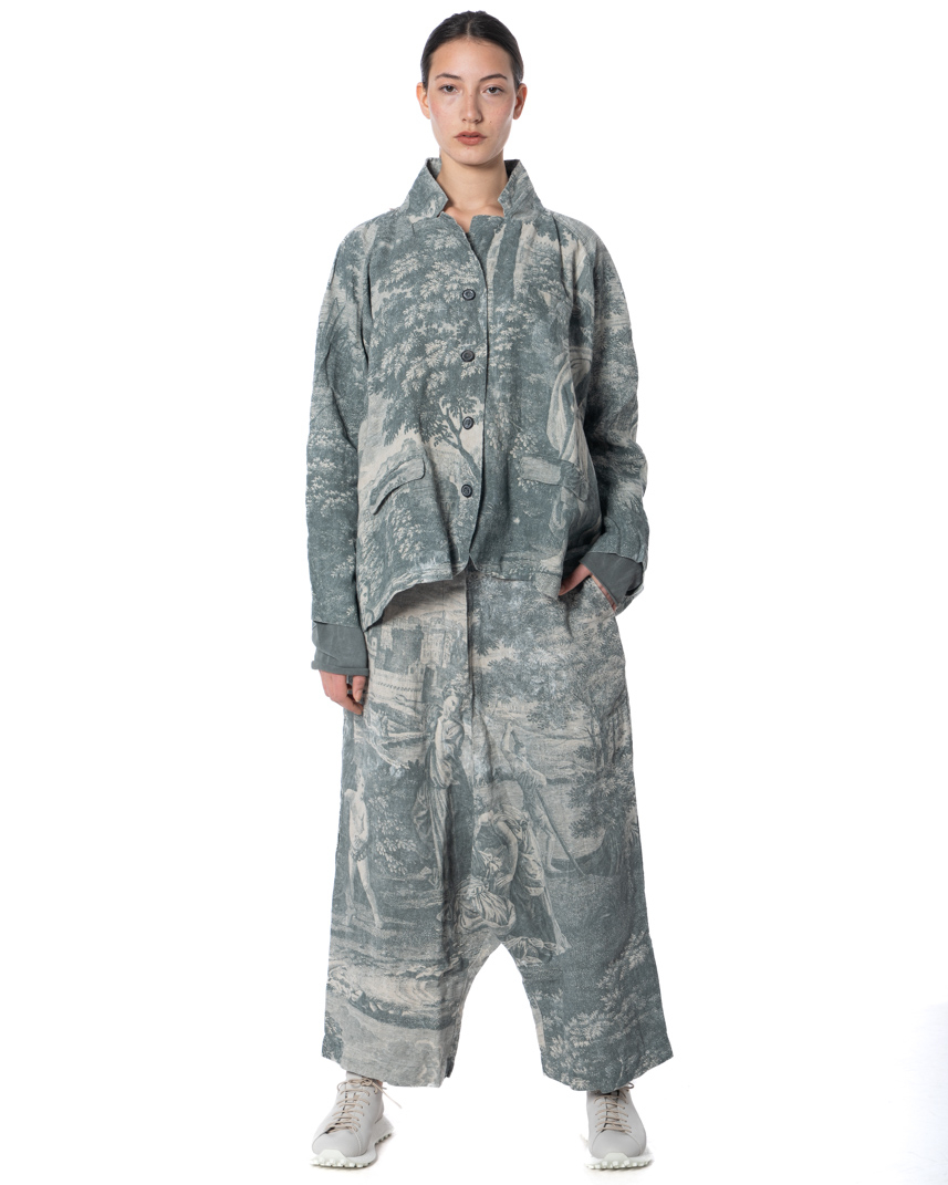 Straight out of a modern-day art archive, this RUNDHOLZ DIP linen jacket brings antique-inspired landscape prints back into the spotlight – and makes them feel strikingly now. Faded engravings, romantic garden scenes and architectural fragments, softly blurred like memories rediscovered. The print feels storied, cultured, almost scholarly. The cut is boxy, slightly oversized, effortlessly avant-garde. The softly crinkled linen adds texture and movement, giving the print a lived-in, tactile quality. Patch pockets and a laid-back collar balance the poetic visuals with utilitarian ease.