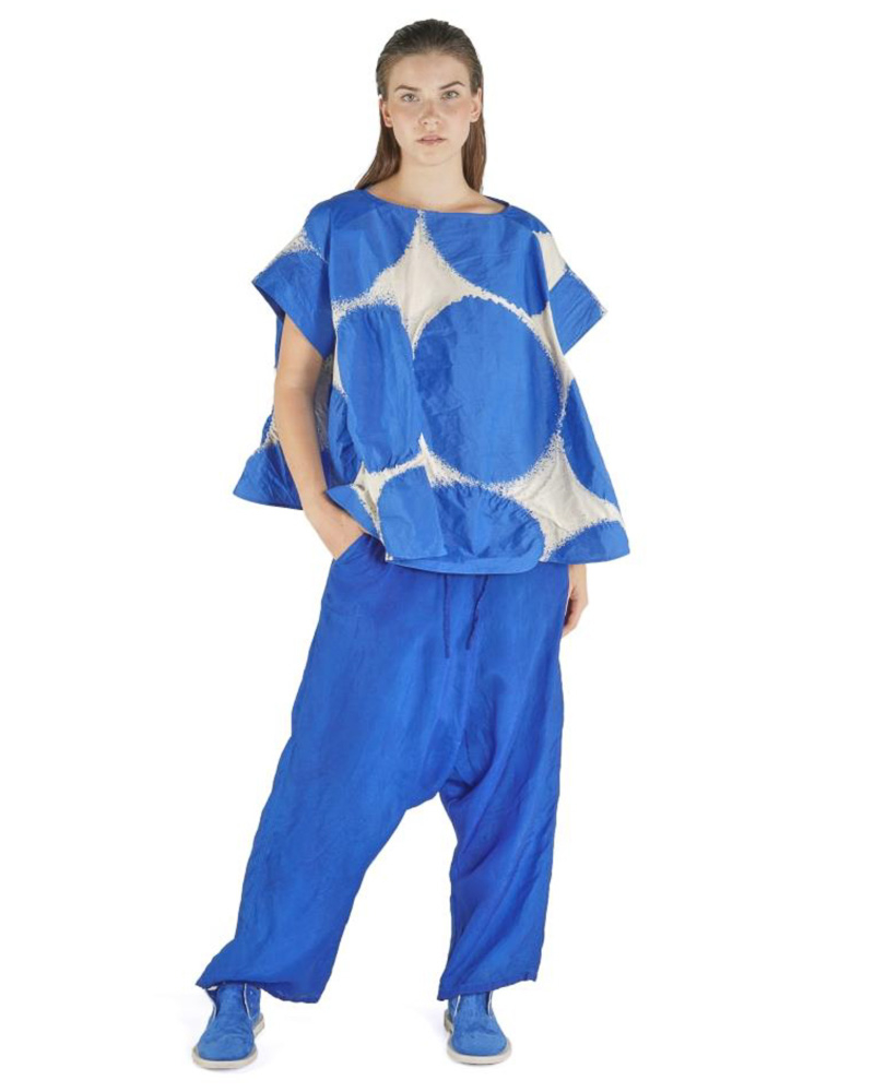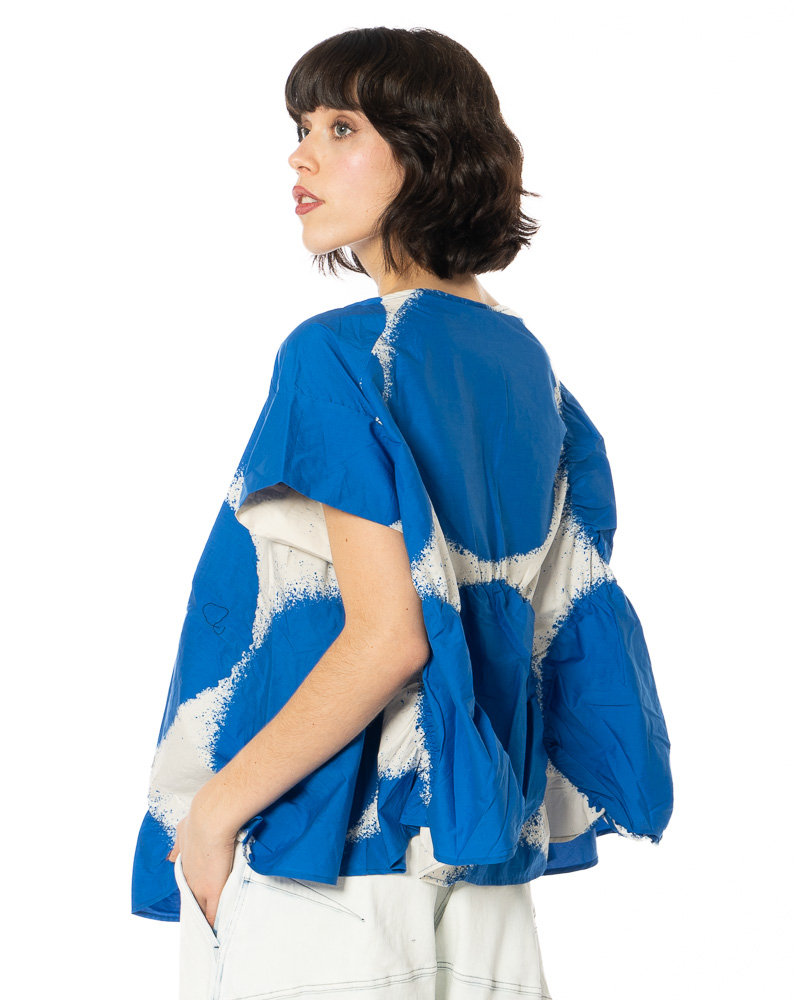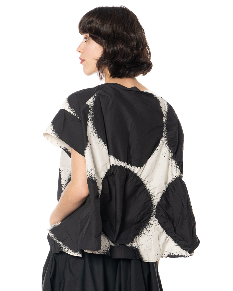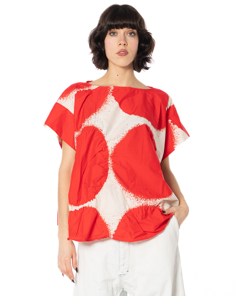 Circle obsession! This graphic design in cotton poplin is dominated by large, spray-paint-inspired dots that tap directly into the current dot trend in fashion. The wide, flared A-line silhouette is a favourite, truly shining on warm summer days. The intentionally generous fit gives the T-shirt that charmingly exaggerated RUNDHOLZ twist: stylish, slightly cheeky yet absolutely wearable. This top proves that fashion can be fun yet still unmistakably avant-garde.