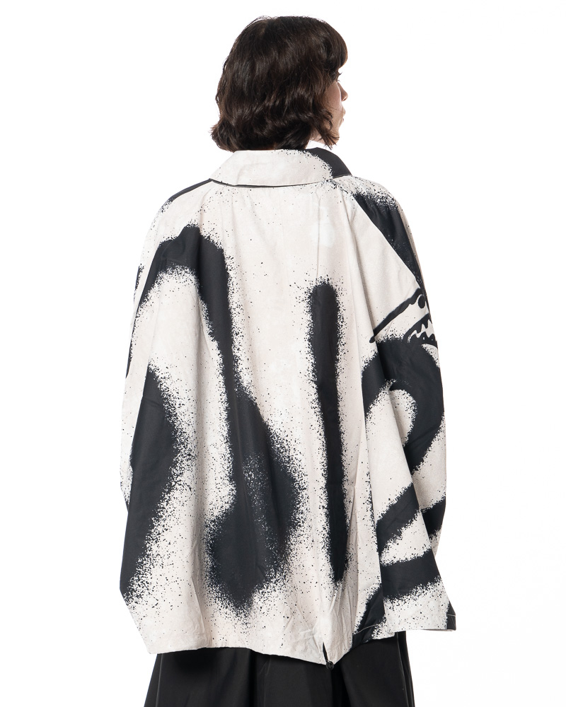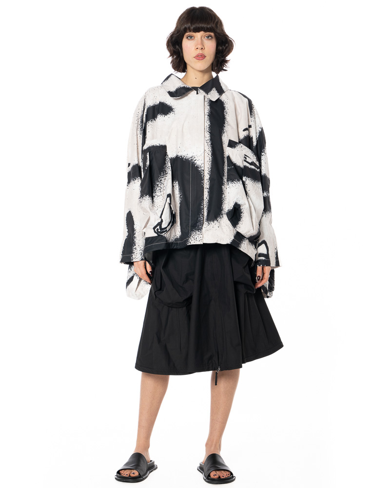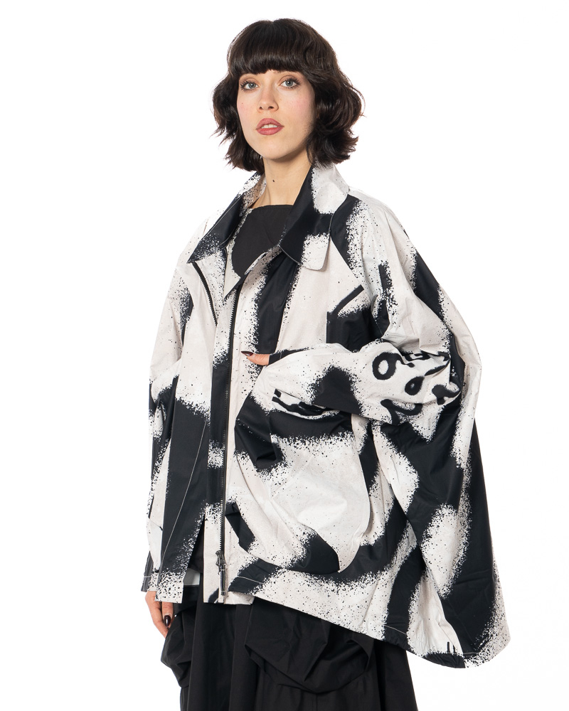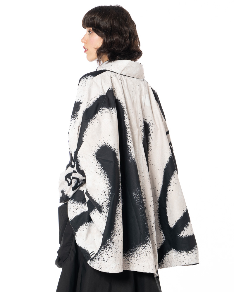 The expressive print extends across the back, sleeves, and front—never repetitive, always full of energy. It's like visual beats pulsing to the rhythm of everyday life. Details such as the dynamic collar, gentle gathers, and subtle seam lines highlight the craftsmanship of this jacket, which connects art and function, chaos and control, and volume and lightness.