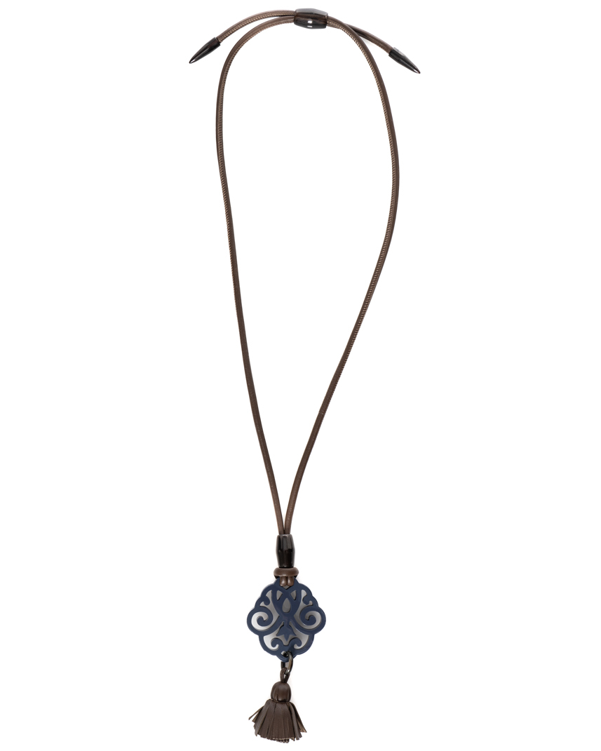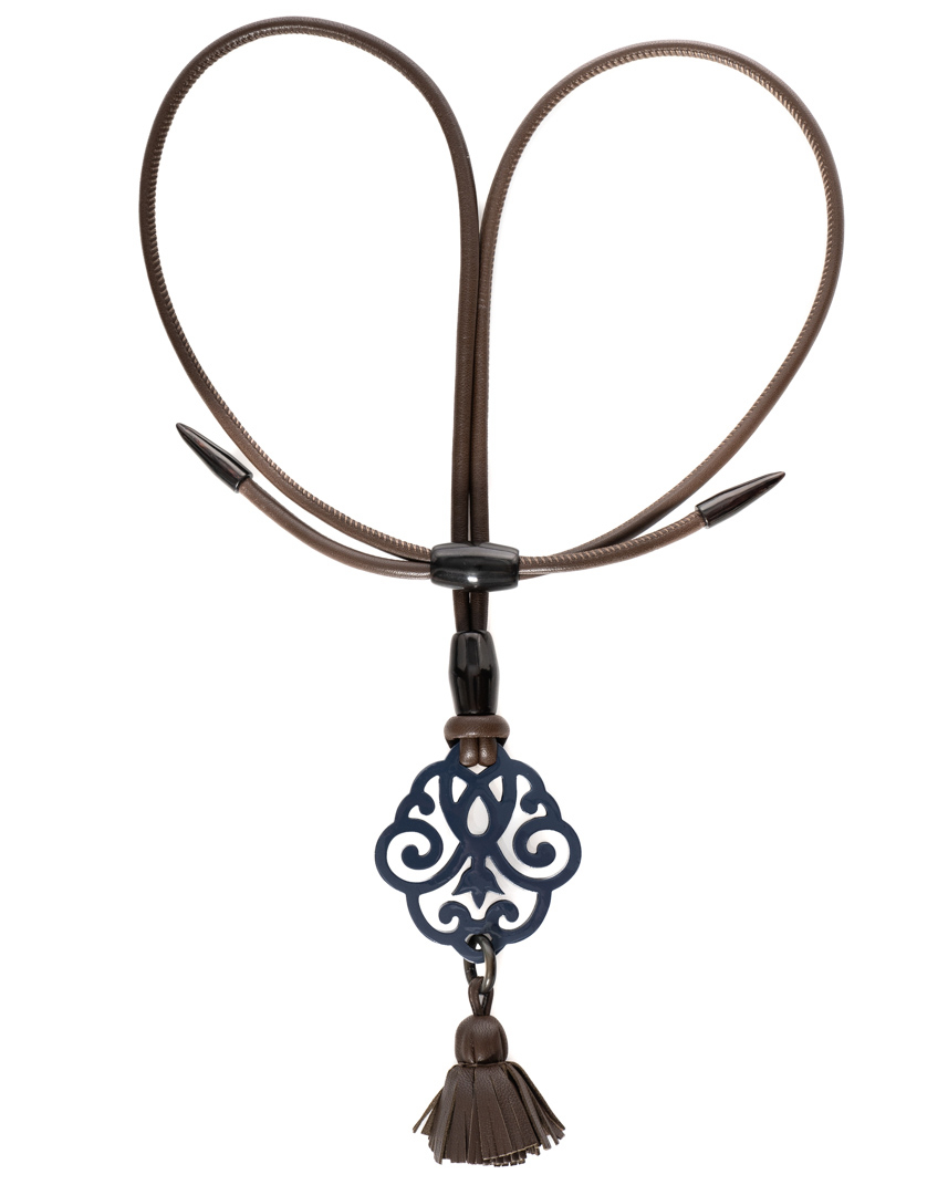 The design captivates with its fascinating symbiosis of ornamental craftsmanship and the fluid, supple feel of a voluminous Nappa leather tassel. The sleek Italian leather cord is further elevated by exclusive details made of buffalo horn tubes and tips.