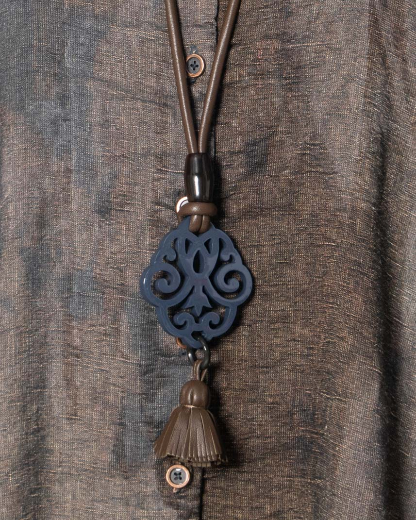 Lacquered buffalo horn meets Italian Nappa leather: the beautiful necklace ALMA MIDNIGHT by YAEL NADIV is the ultimate power piece for your wardrobe. At its heart lies an intricately hand-carved Art Déco pendant crafted from precious buffalo horn, its deep blue lacquer capturing the light as mysteriously as a clear midnight sky.