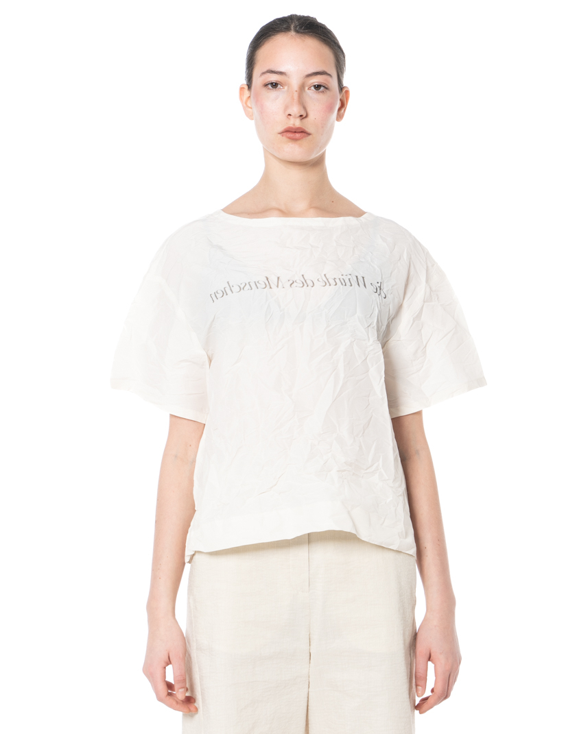 Both versions share the characteristic boxy shape: clear, confident, and contemporary. The slightly cropped silhouette skims the waist, while wide sleeves and a precise neckline create a relaxed yet refined look. Whether paired with linen trousers or denim, this shirt proves that true dignity lies in understatement.