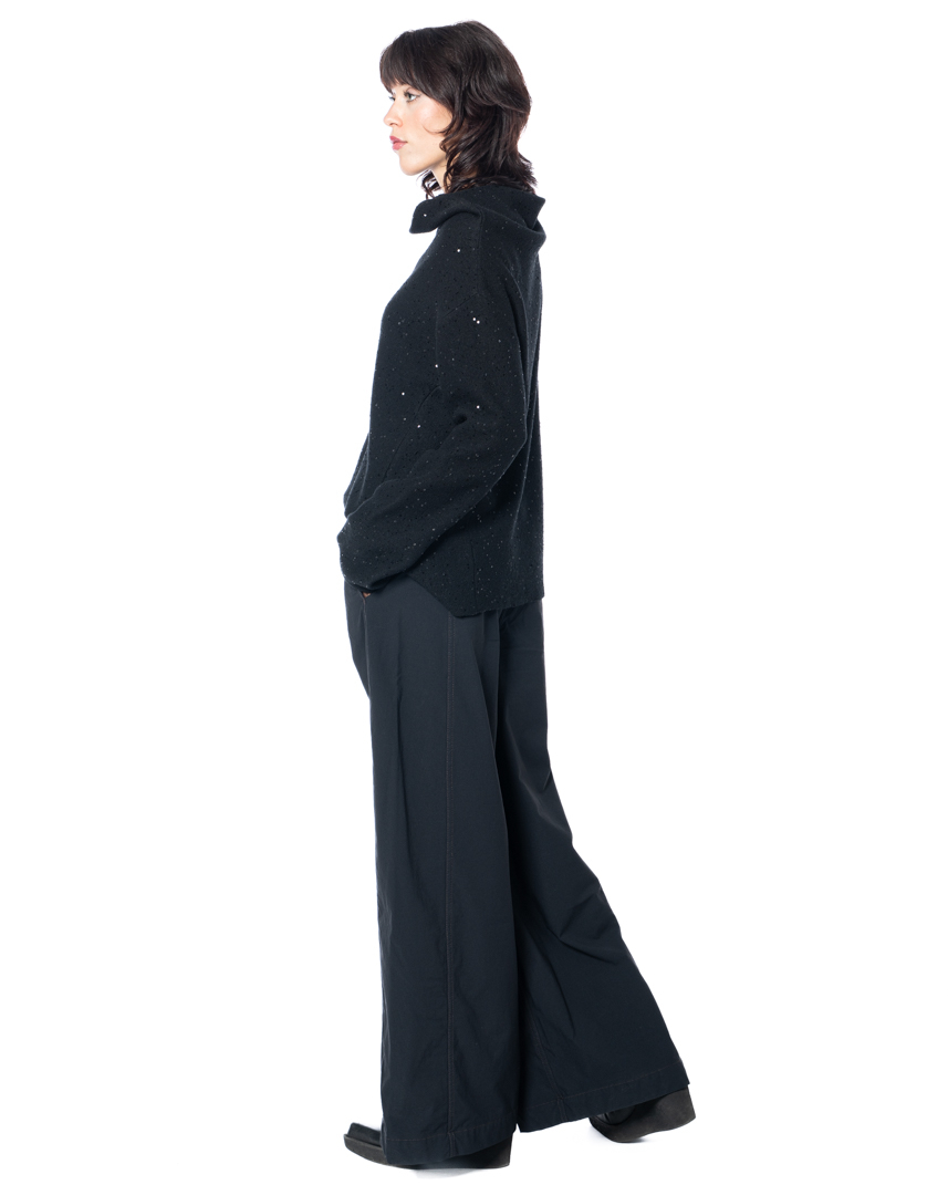 The construction of the pants is evident in the details: precisely placed pleats, functional side pockets, and a minimalist zipper that blends elegantly into the overall design.