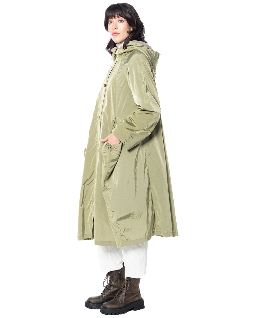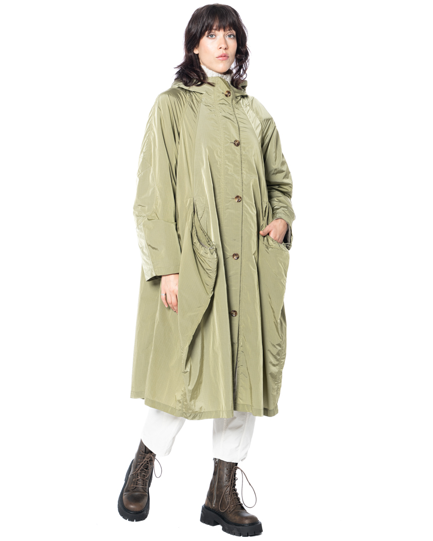 Make a fresh statement this season with the eye-catching designer coat NORI by annette görtz! Featuring a generous hood, voluminous sleeves and a removable soft lining, this exclusive piece combines functionality with high-end design. The distinctive front pockets with elastic detail add subtle sophistication, while the 100% recycled nylon fuses sustainability with a luxurious sheen.